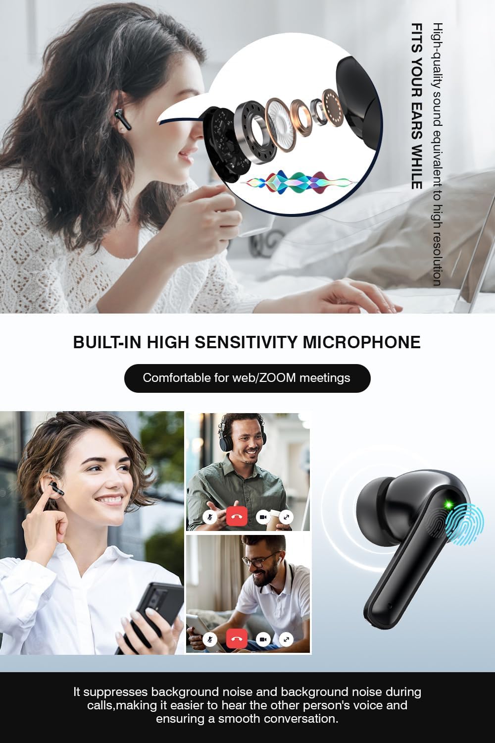【Touch Control】Easy Touch control brings you a more comfortable and convenient experience to answer phones,switch songs and activate voice assistant without operating your mobile device frequently,just easily control it by a simple press on the earbuds.