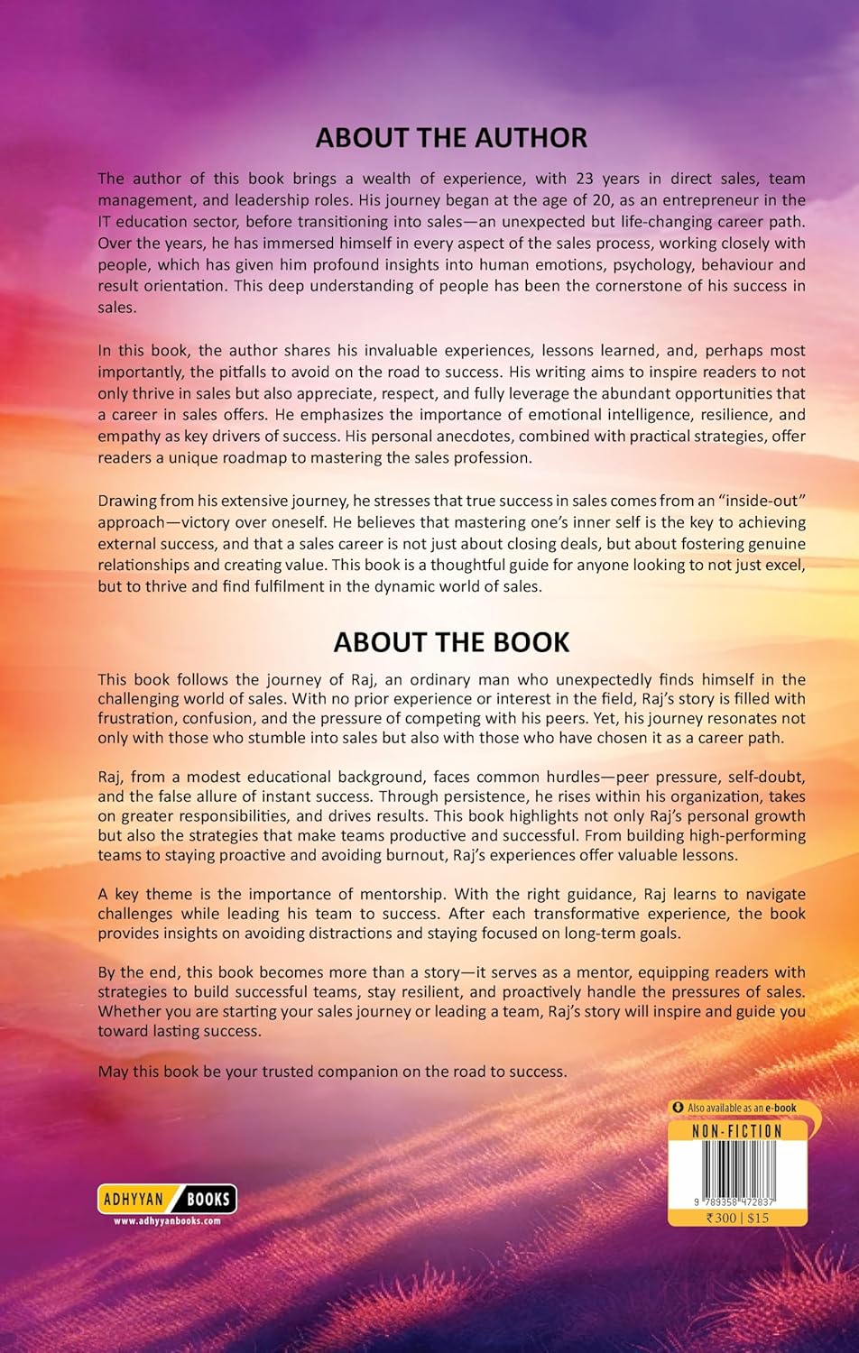 This book follows the journey of Raj, an ordinary man who unexpectedly finds himself in the challenging world of sales. With no prior experience or interest in the field, Raj’s story is filled with frustration, confusion, and the pressure of competing with his peers. Yet, his journey resonates not only with those who stumble into sales but also with those who have chosen it as a career path. Raj, from a modest educational background, faces common hurdles—peer pressure, self-doubt, and the false allure of instant success. Through persistence, he rises within his organization, takes on greater responsibilities, and drives results. This book highlights not only Raj’s personal growth but also the strategies that make teams productive and successful. From building high-performing teams to staying proactive and avoiding burnout, Raj’s experiences offer valuable lessons. A key theme is the importance of mentorship. With the right guidance, Raj learns to navigate challenges while leading his team to success. After each transformative experience, the book provides insights on avoiding distractions and staying focused on long-term goals. By the end, this book becomes more than a story—it serves as a mentor, equipping readers with strategies to build successful teams, stay resilient, and proactively handle the pressures of sales. Whether you are starting your sales journey or leading a team, Raj’s story will inspire and guide you toward lasting success. May this book be your trusted companion on the road to success.