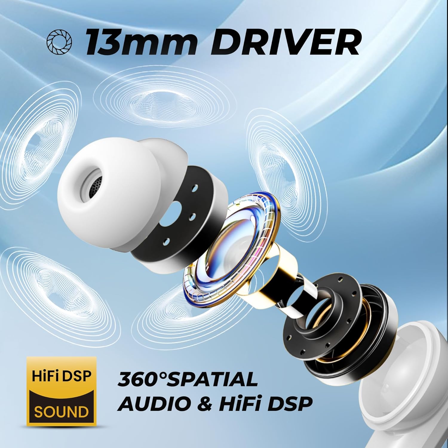 🎵 Superior Sound with 13mm Dynamic Drivers & Hi-Fi DSP: Experience rich audio quality with 13mm dynamic drivers enhanced by Hi-Fi DSP Sound. Enjoy deep, resonant bass, clear highs, and balanced mids that bring every detail of your music and games to life. The 360-degree Spatial Audio further elevates the soundstage, making each sound element feel like it’s coming from all around you for a truly immersive experience.