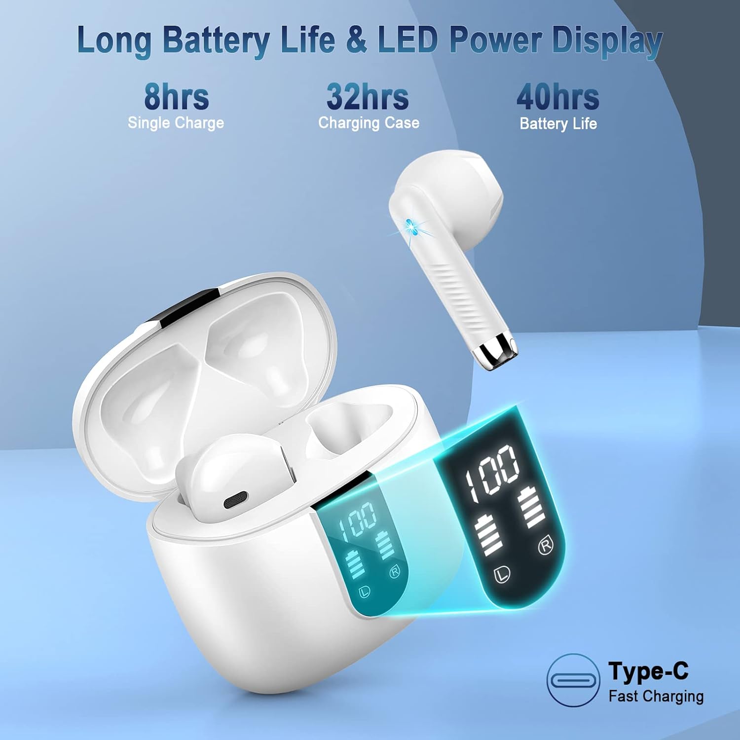 40H Battery Life and Dual LED Display: Bluetooth earbuds work for 8H on a single charge, up to 40H with a charging case. With a fast charging USB-C interface, the wireless earbuds bluetooth be fully charged only need 1hour. Features with smart LED digital display, you can easily know the battery consumption on both wireless headphones in ear and the charging case, so you can master the time to charge it.