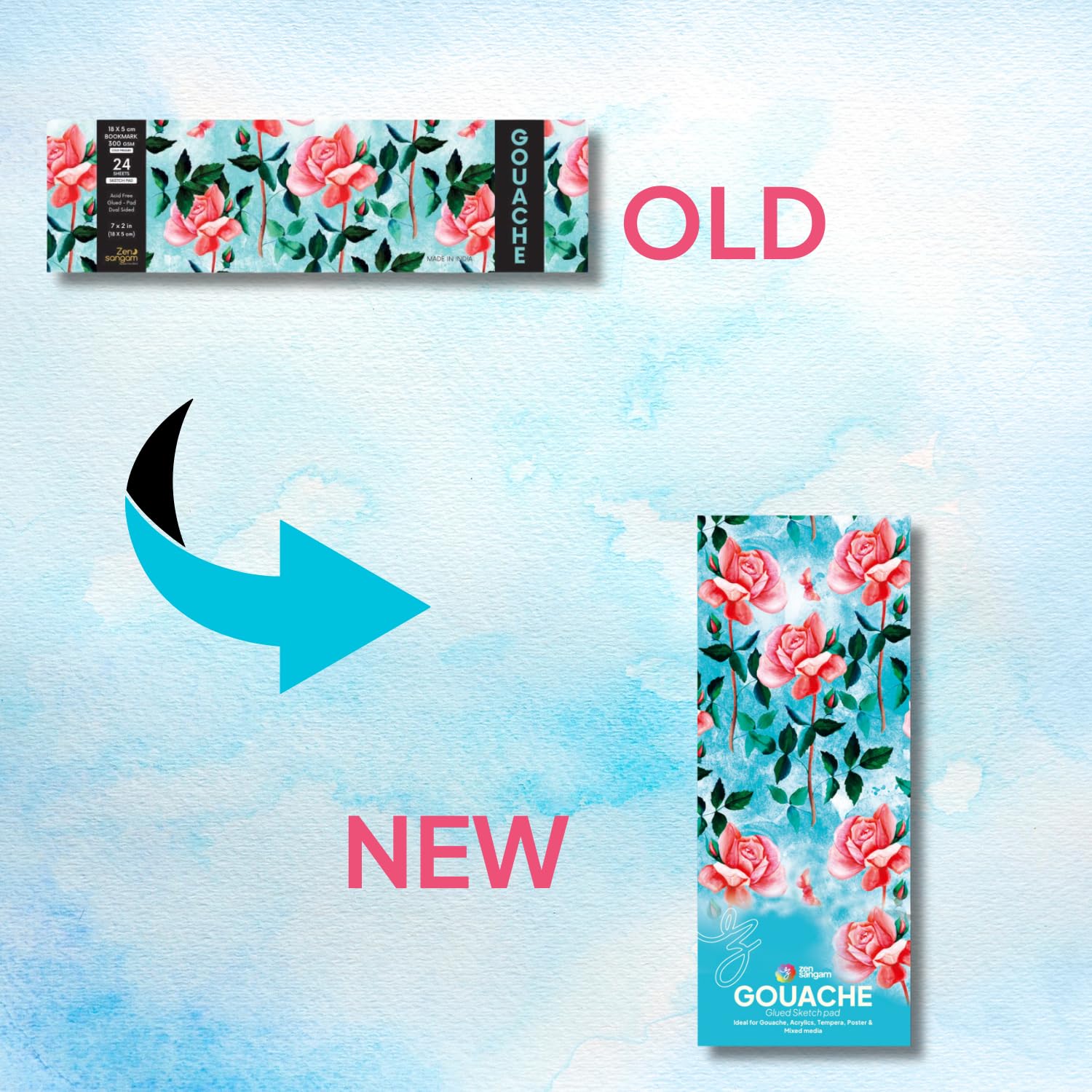 A Glued Sketchpad with 24 Sheets of Bookmark Size (18x5cm) 300 GSM Cold Pressed Gouache Paper.