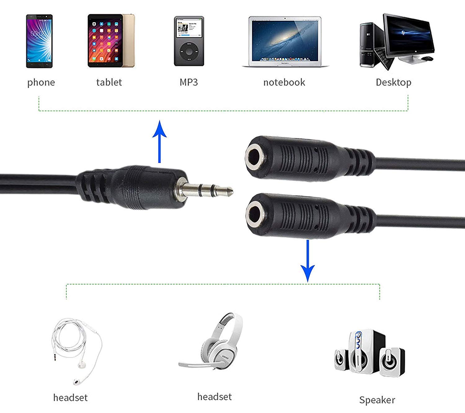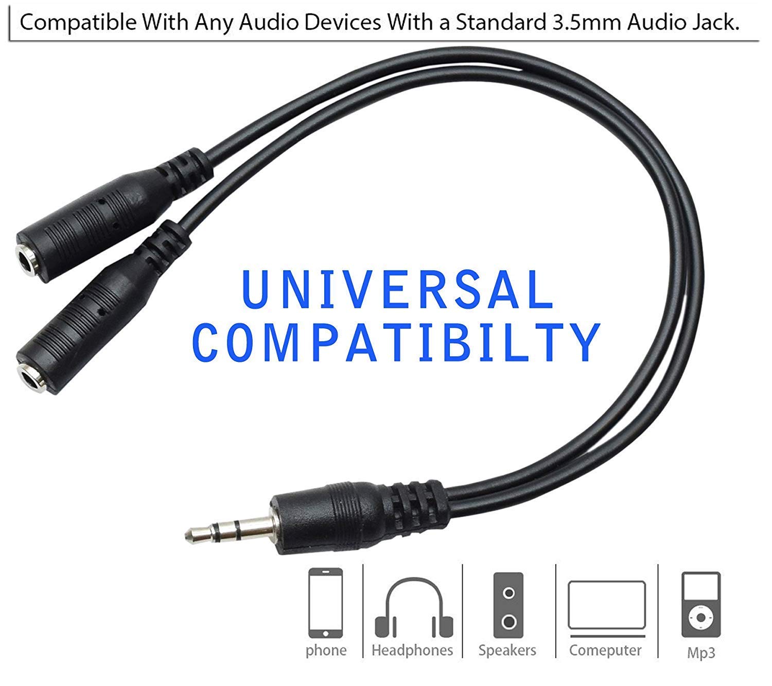 This Innovative Headphone Splitter adapter converts a single 3.5mm stereo jack to two 3.5mm stereo jacks. Y type design, share two audio at the same time. It is a great solution to share cool music, movies and games with your families and friends.