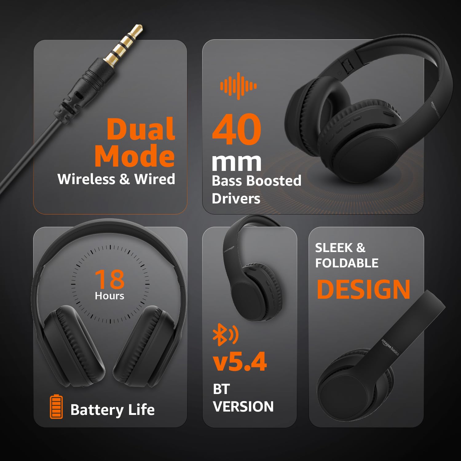 Amazon Basics Wireless Over Ear Headphones, Bluetooth 5.4, 40mm Drivers, 18H Playtime, Foldable Lightweight Design with Aux Support, Deep Bass & Mic, Black