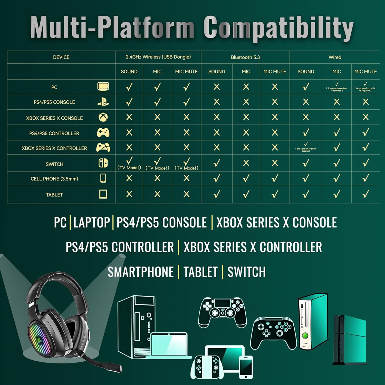 2 Connection Modes & Multi-Devices Support – Enjoy seamless connectivity with the gaming headset via a 2.4GHz USB dongle / Type C, for PC, PS4, PS5, Switch (Mic not supported) and more controllers. Switch to Bluetooth mode of wireless headset supports connection to most mobile devices.