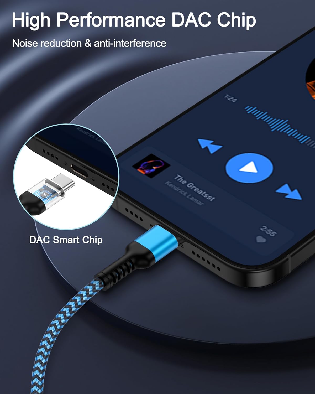 Premium Sound Quality – iPhone 15 car aux cable chord, equipped with an original ending and powerful DAC chip, housing the multi-layered inner core premium materials. 24K gold-plated contacts ensure to provide the cleanest sound experience possible. Enjoy your fantastic music trip by using this usbc to 3.5mm aux audio cable