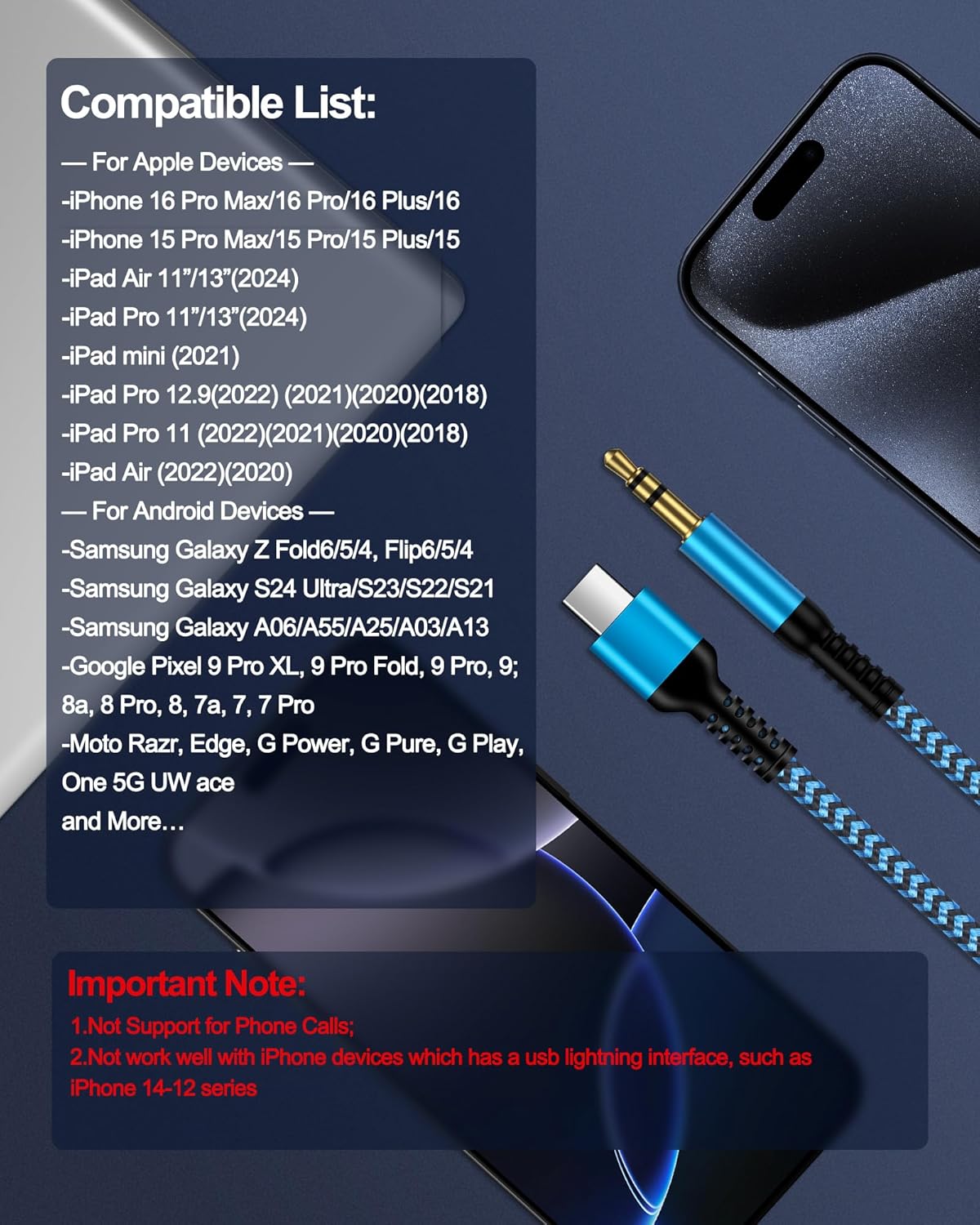 Plug and Play – The usb c to aux cable is easy to connect with your iPhone 16 15 series and c port android devices directly, without any driver or an extra usbc adapter. It is Compatible with all devices having regular or recessed 3.5mm audio jacks, such as smartphones, tablets, laptops, computers, mp3 players, car stereos, headphones, Hi-Fi, and portable speakers