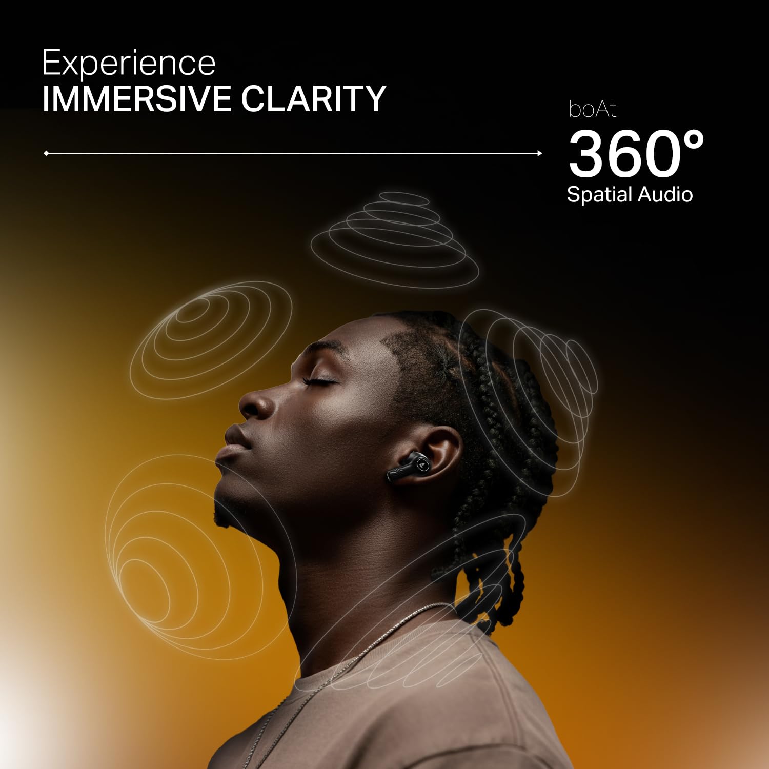 boAt 360º Spatial Audio: Get enveloped by captivating sound powered by boAt 360º Spatial Audio. Be it thrilling chase scenes or superhero movies, these earbuds recreate the cinematic effect by creating your own soundscape.
