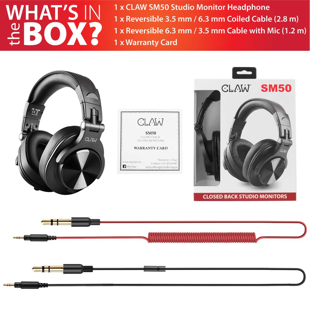 🎧 [What’s included]: CLAW SM50 Headphones, 2.8m Coiled Cable, 1.2m Straight Cable with Mic & In-line controls, Warranty card offering 12 months warranty.