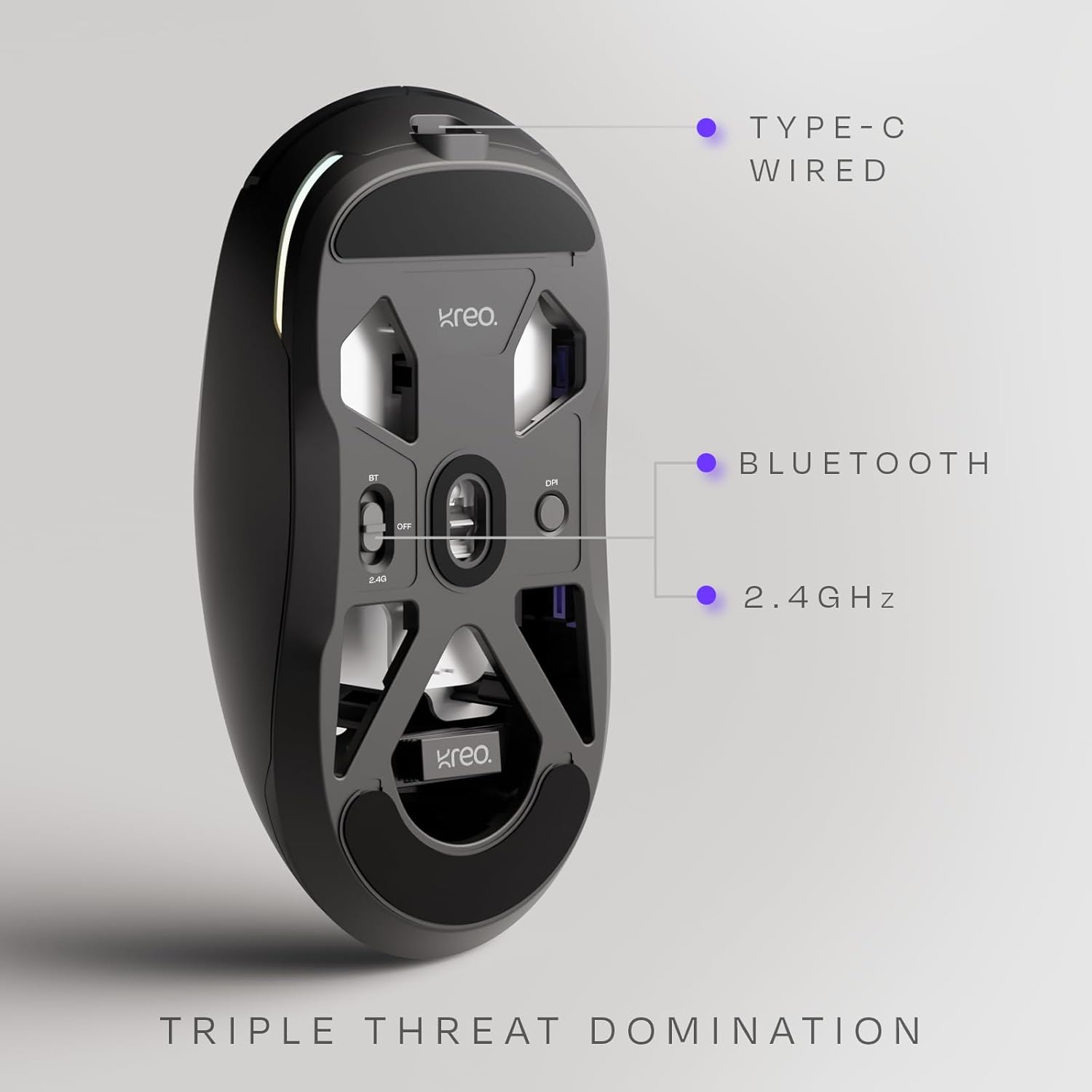 💻Versatile connectivity options: Kreo Pegasus ultra-light gaming mouse ensures you seamlessly switch between Bluetooth, wired, and 2.4GHz modes, for adaptability to diverse gaming setups and preferences. Its battery capacity stands at 400mAh.