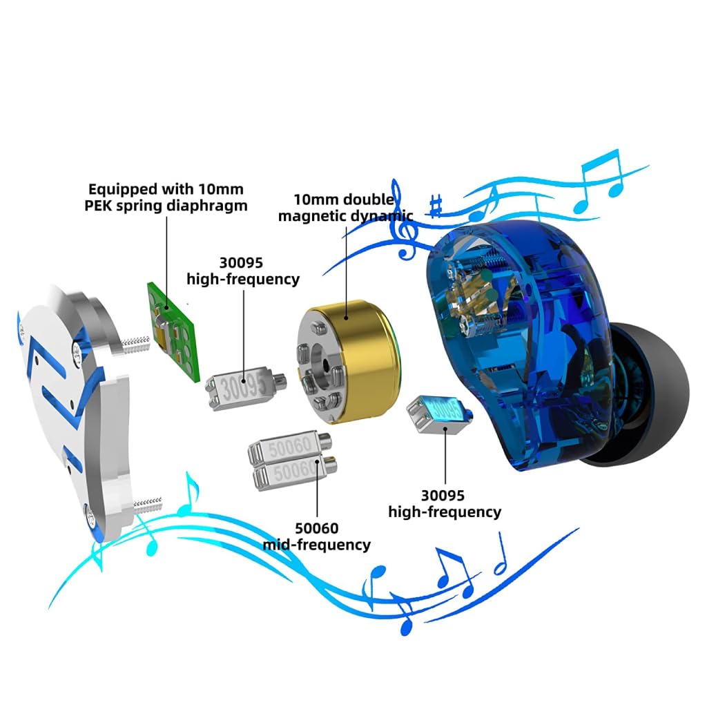5-Driver Hybrid Configuration: The KZ ZS10 PRO IEM features a hybrid setup with 5 drivers per side: 4 balanced armature drivers (2 x 30095 high-frequency, 2 x 50060 mid-frequency) for clear highs and mids, and a second-generation Tesla double magnetic dynamic driver for deep, powerful bass. This configuration ensures a rich, immersive sound experience with precise detail across all frequencies.