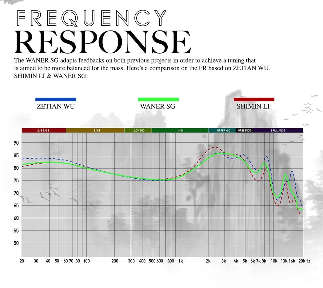 【Dual Cavity Chamber, Fine Tuning】With massive useful feedback from the previous earphoines, the Wan’er S.G has been altered and improved in three frequencies in order to achieve a tuning that is aimed to be more balanced for the mass. When you look at the comparison of Zetian Wu, Waner S.G and Shimin Li, you will find out the difference