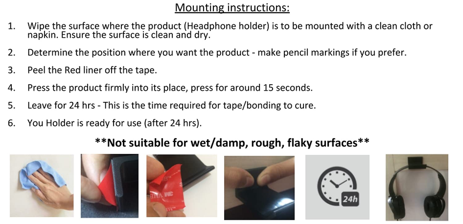 Thoughtfully designed headphone holder. Holds very strongly with 3M VHB tape. No screws required. Compatible with most Gaming and Regular headphones like Bose, Sony, Beats, Audio-Technica, AKG, Senheiser etc.,