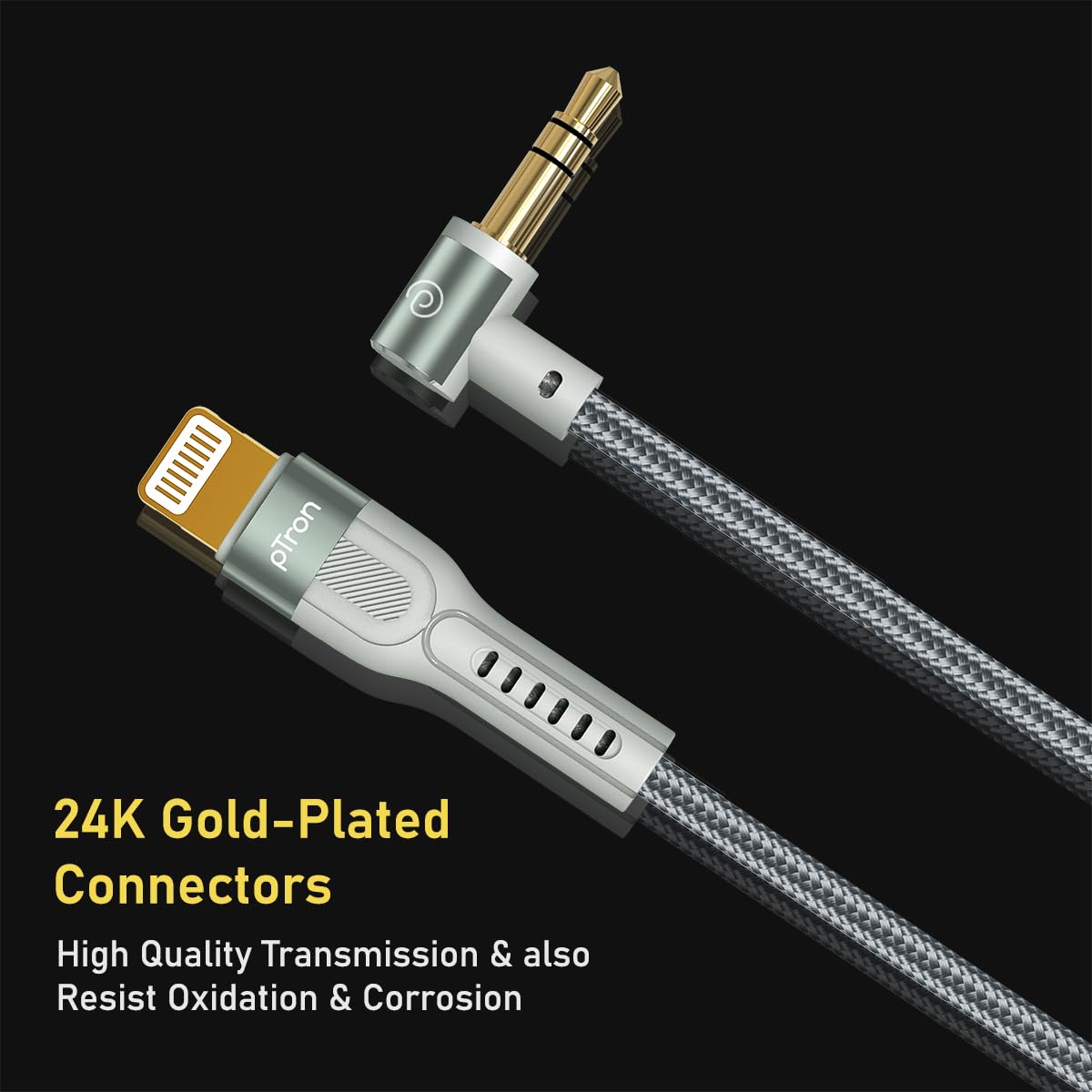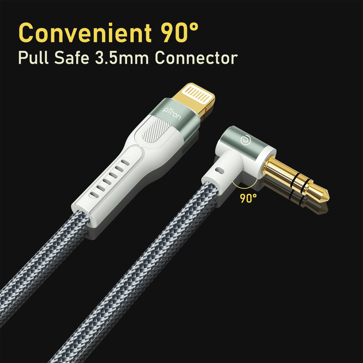 pTron 8-pin iOs to 3.5mm Aux Cable, 1.5m Nylon Braided, 90 Degree Gold-plated Connector, Male to Male Audio Cable, Metal Heads, Compatible with iPhone x/8/7/plus/6/6s/xs/xr/xs max, Solero A15 (Grey)