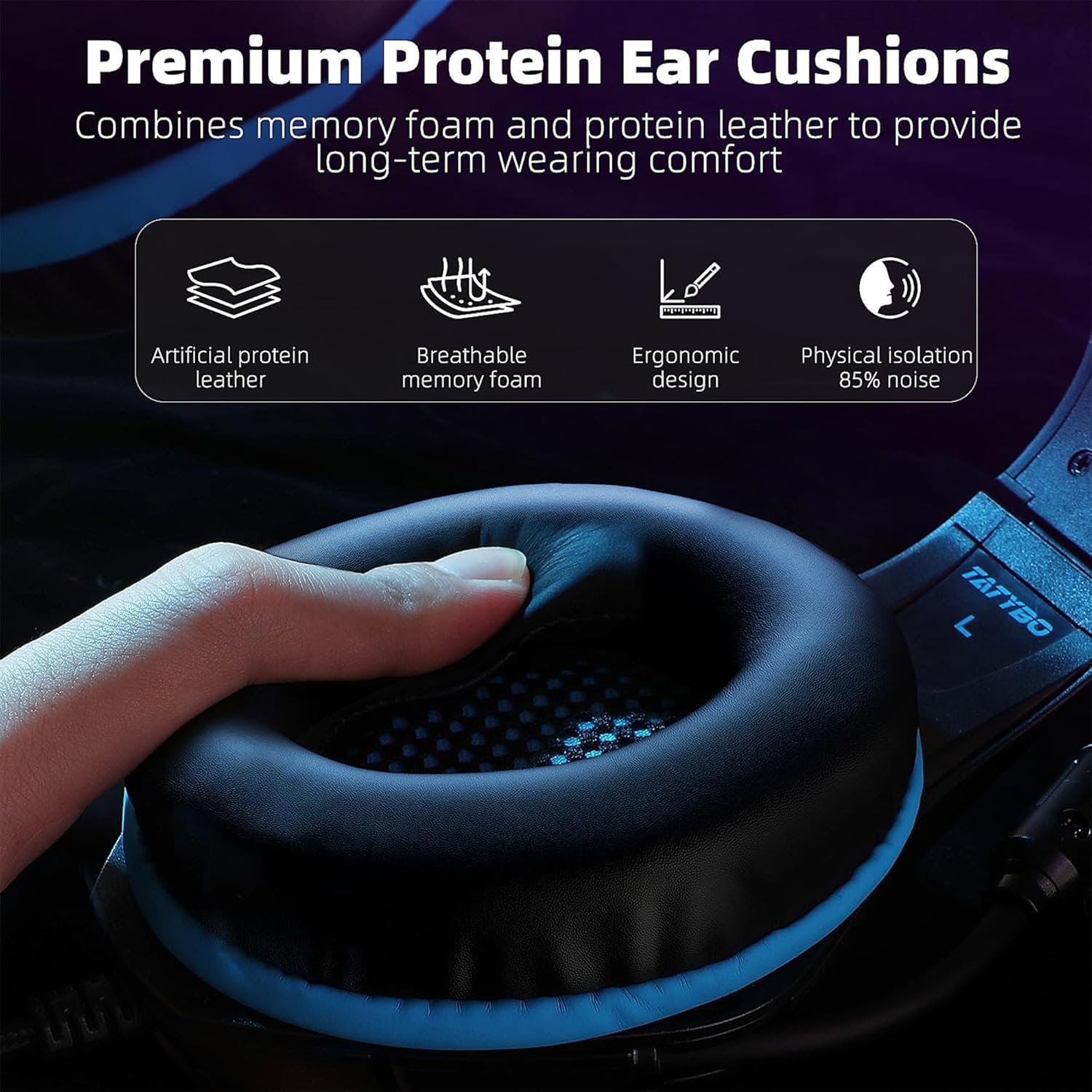 Comfortable & Stylish Design: Soft, breathable protein over-ear pads and adjustable headband ensure long-lasting comfort, while LED lights enhance the gaming atmosphere.
