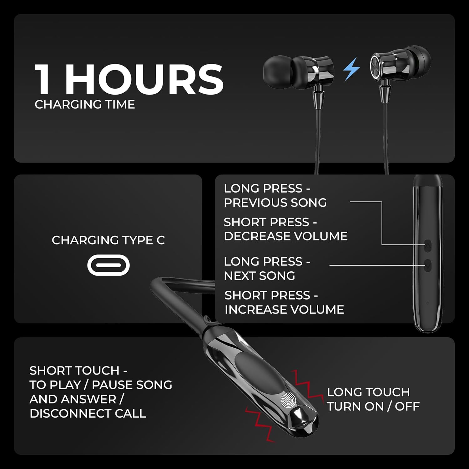 Playtime:- 60 hours of playtime gives your audio sessions company for days. Thanks to a long lasting battery and quick charging of 1 hour.