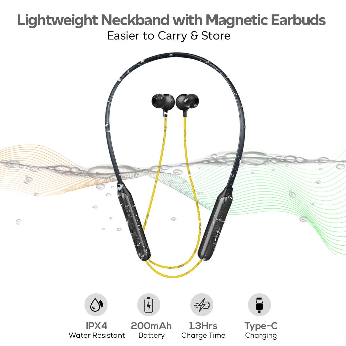 Attractive ergonomics with a lightweight sturdy built (just 26gms); Bluetooth headphone with mic comes with Bluetooth 5.2 for seamless 10mtrs connectivity, quick pairing, and broad compatibility.