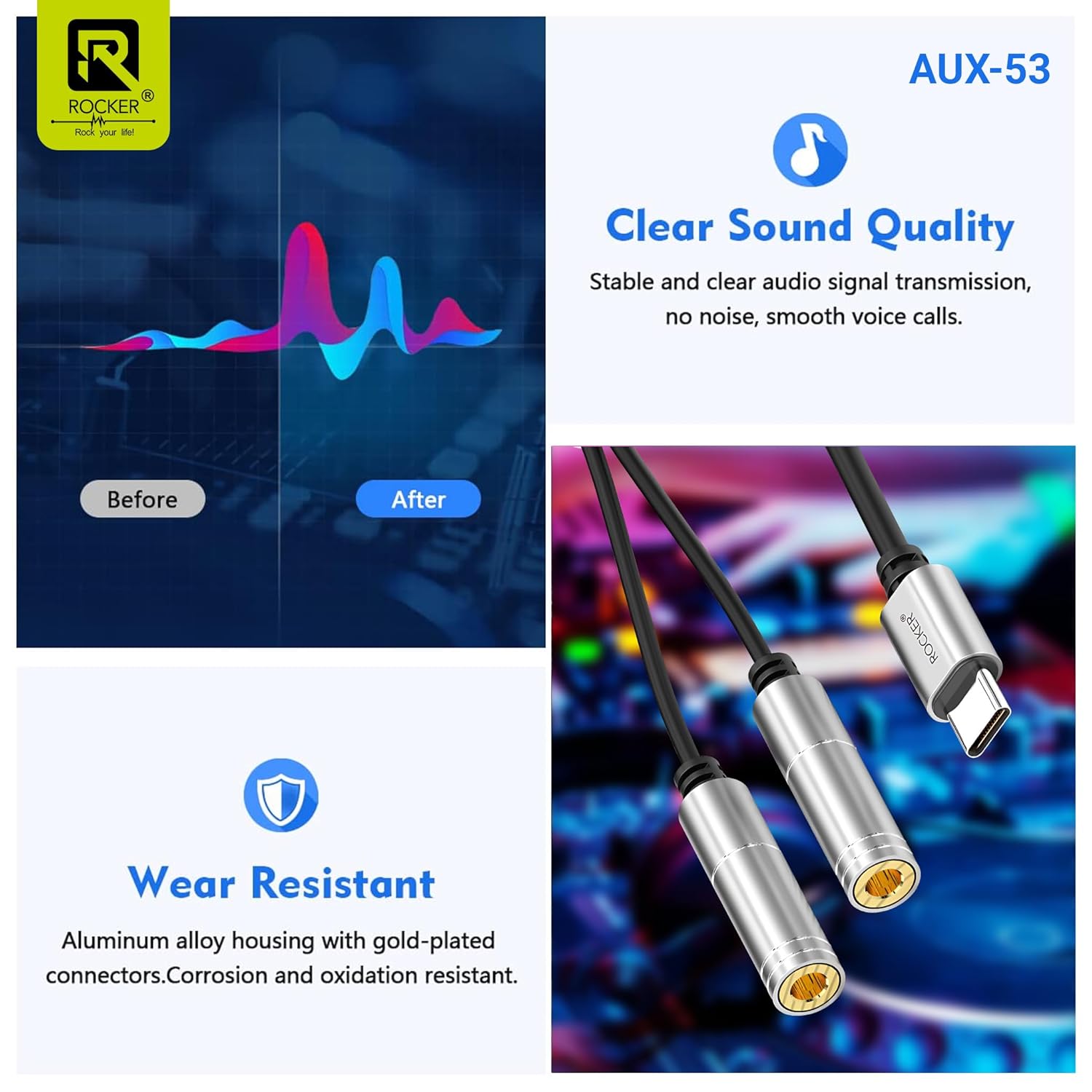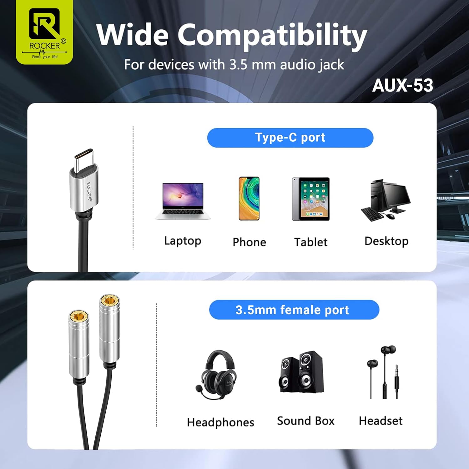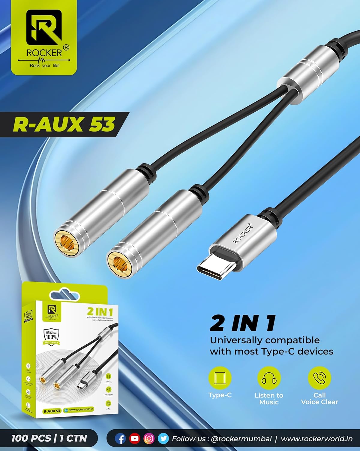 Experience seamless audio sharing with the Rocker R-AUX 53 Type-C Headphone Splitter. This versatile 2-in-1 adapter transforms a single USB-C port into dual 3.5mm audio outputs, perfect for connecting two headphones or earphones simultaneously. The premium gold-plated connectors and durable braided cable ensure reliable performance and crystal-clear sound transmission. Whether you’re watching movies with a friend, collaborating on projects, or gaming together, this adapter delivers high-fidelity audio without compromise. The splitter features universal compatibility with various Type-C devices including smartphones, tablets, laptops, PS5, Xbox, and other gaming consoles. Its reinforced design and professional-grade construction make it ideal for travel, entertainment, and daily use. Enjoy noise-free calls and superior sound quality while sharing your favorite content with others. The compact and portable design means you can carry it anywhere, making it an essential accessory for modern digital lifestyles.