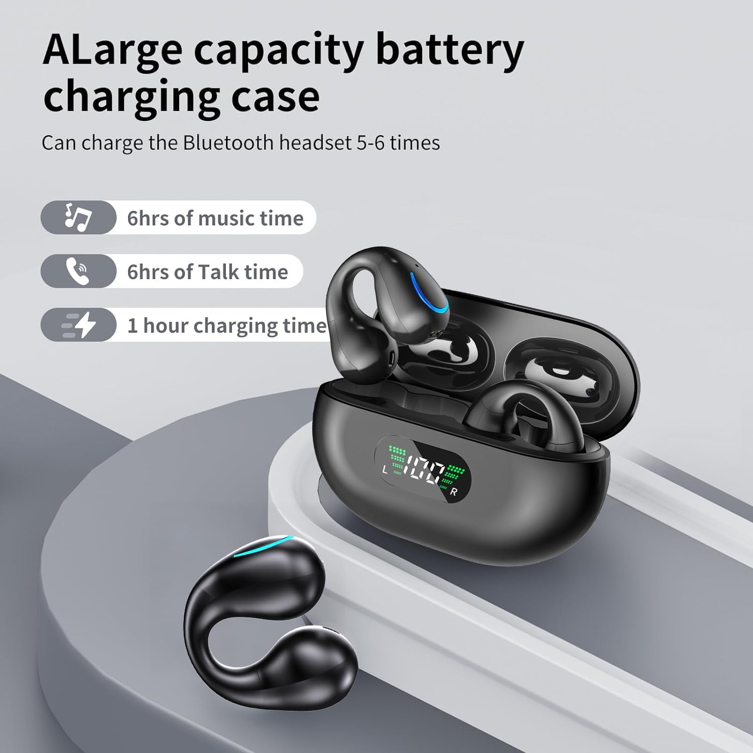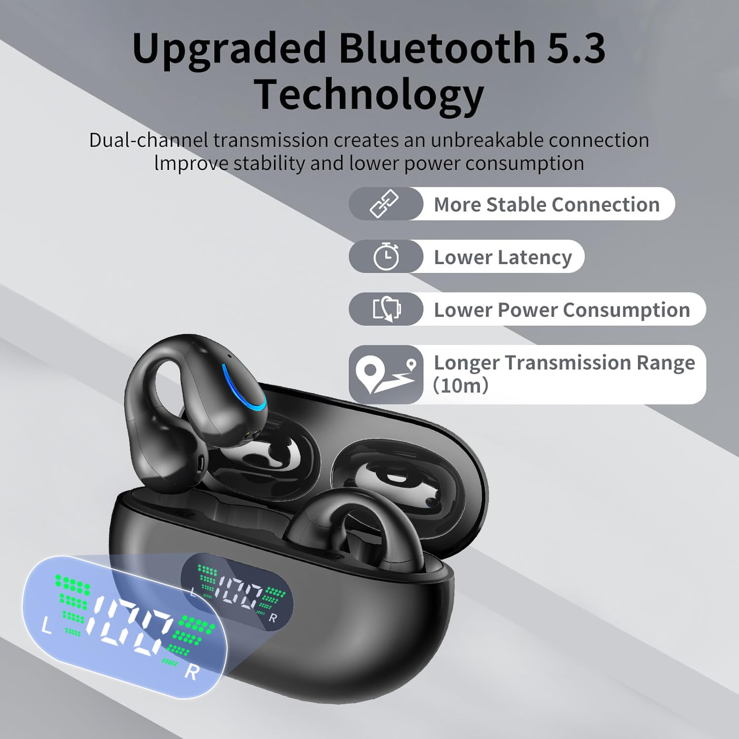 Open Ear Bone Conduction Headphones Bluetooth 5.3 Wireless Open Clip Ear Earbuds Built-in Mic with Ear Hooks 60 Hours Playtime Sport Earphones IPX7 Waterproof for Fitness Running Black