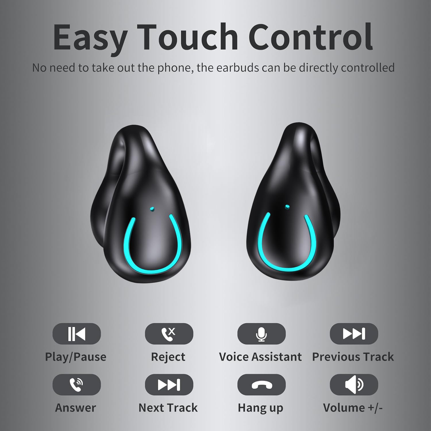 【IPX7 Waterproof and Button Control】: This wireless earbuds has IPX7 waterproof and rigid seam design, easily resists movement or all-weather conditions in rain and sweat. Music and phone calls are easily controlled via the multifunction buttons on wireless headphones. Simple button control, very convenient to play/pause music, change songs, volume +/-, activate Siri, answer/hang up/reject incoming calls, while also preventing accidental touches.