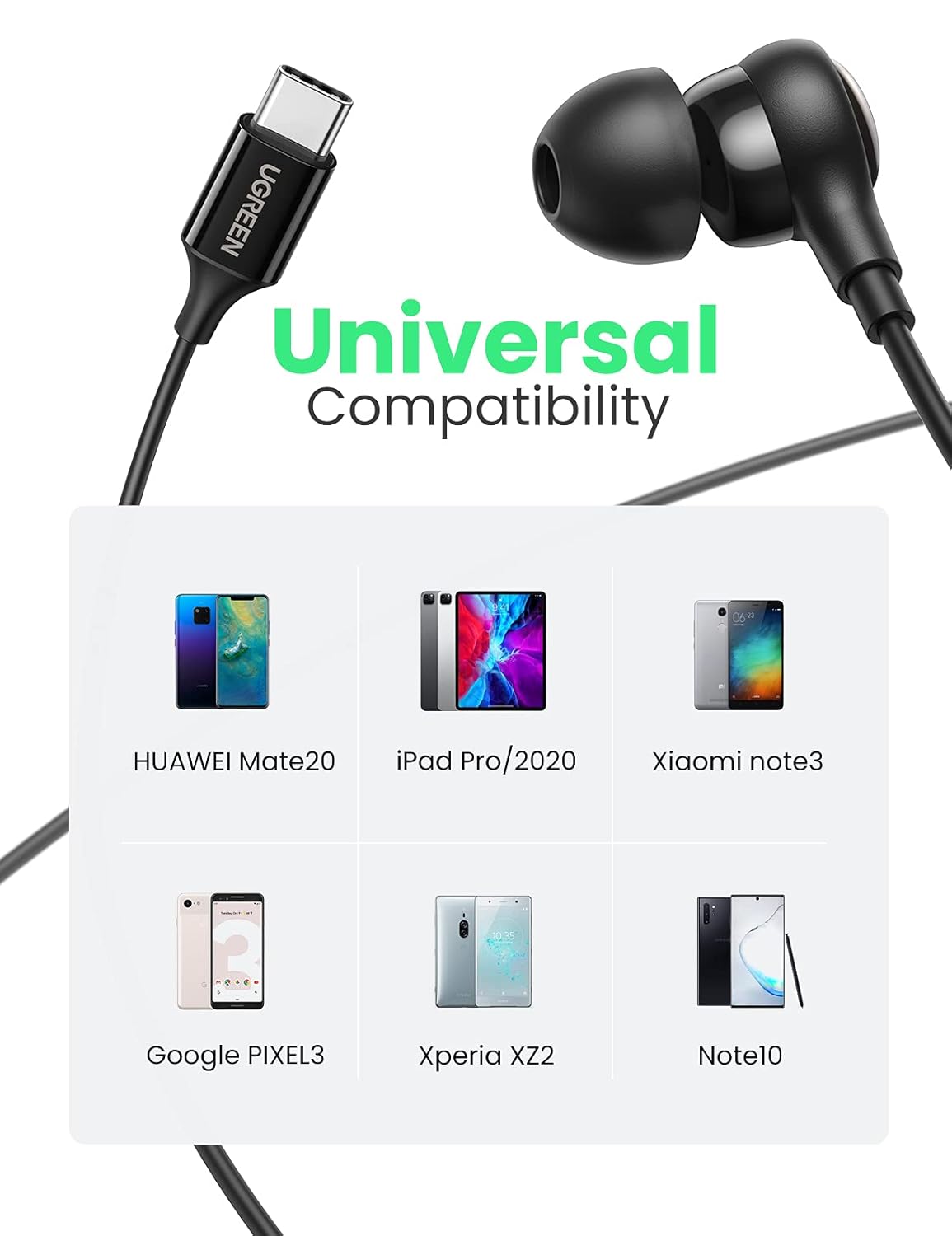Wide Compatibility: UGREEN USB-C headphones is compatible with the most Type-C smartphones, tablet computers and laptops. This wired earbuds is compatible with iPhone 16, iPhone 16 Plus, iPhone 16 Pro, iPhone 16 Pro Max, Galaxy S23 Ultra, S23, S23+, S22, S22 Ultra, S22 Plus, S21, Note 10, OnePlus 10, 10 Pro, 9, 9 Pro, 8T, 8 Pro, 8, 7T Pro, 7T, 7 Pro, 7, Google Pixel 7, 6, 6 Pro, 5a,Xperia XA2/XA2 Plus, iPad Pro 2022 2021, and other devices with type C audio connection.