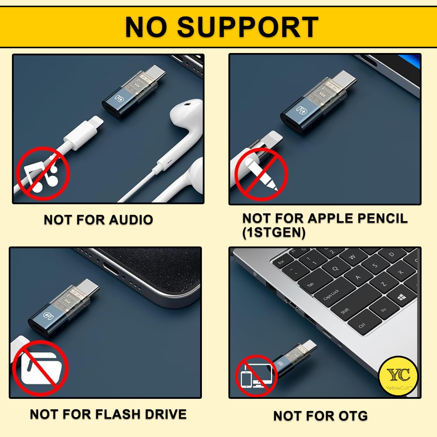 Important Notice: This lightning to usb c cable adapter can charge and data sync between your phone and computer. Not support OTG video and audio functions, headphones, Not for App-le Pencil (1st gen), flash drive, sd card reader,square reader, printer, microphone, camera, mouse, keyboard, Hubs, HDMI converter,etc.