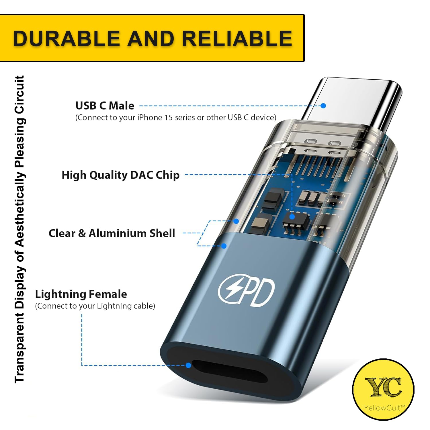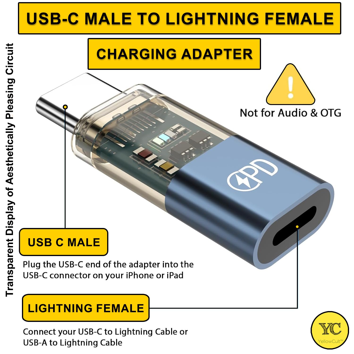 35W Fast Charging & Data Transfer: YellowCult Lightning to USB C adapter can realize the maximum 35W PD fast charging and data transfer speeds of up to 480 Mbps between your phones and computers, making Latest iPhone devices or iPads directly compatible with Lightning cable. Saves the trouble of carrying extra cable around. Plug and play, no additional drive or installation required. NOTE: This adapter does not support Headphone & OTG.