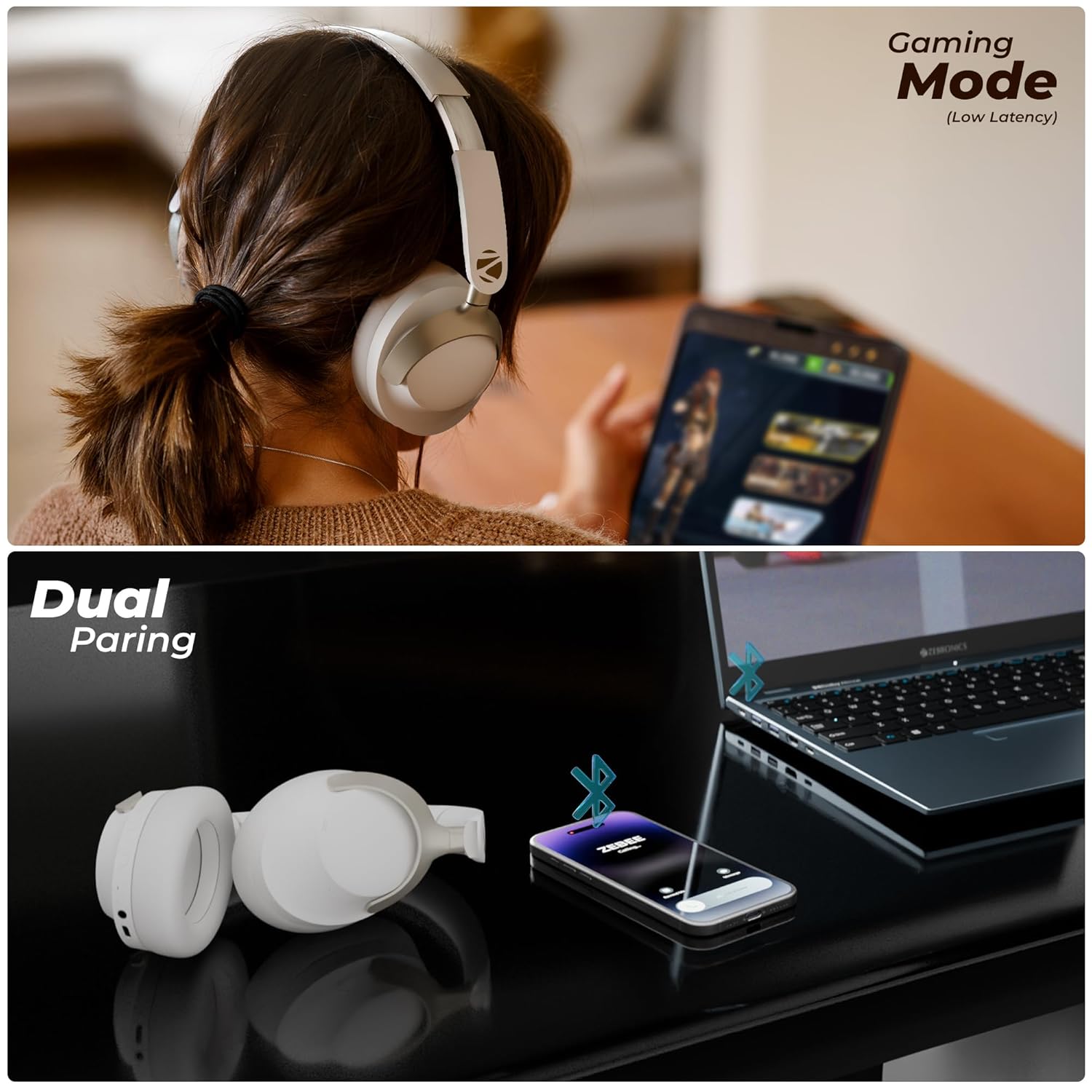 Redefine your audio experience with ZEB-Silencio 111 wireless headphones. Equipped with 40mm titanium drivers, these headphones bring your music to life with rich, immersive sound. Experience peace and focus with hybrid ANC of up to 50dB, or stay aware with transparency mode. It comes with 55 hours* of playback (*@ 50% volume with ANC off) and rapid charging support that gives 8 hours* of use in just 10 minutes (*@ 50% volume with ANC off). Whether gaming with low-latency gaming mode or switching between the 3 EQ modes – equalizer, sound monster, or vocal enhance, the headphones adapt to your vibe. Dual pairing, ENC for calls, BT v5.4, AUX, and voice assistant support ensure seamless connectivity. All this comes in soft, comfortable ear cushions and a built-in rechargeable battery for all-day wear.