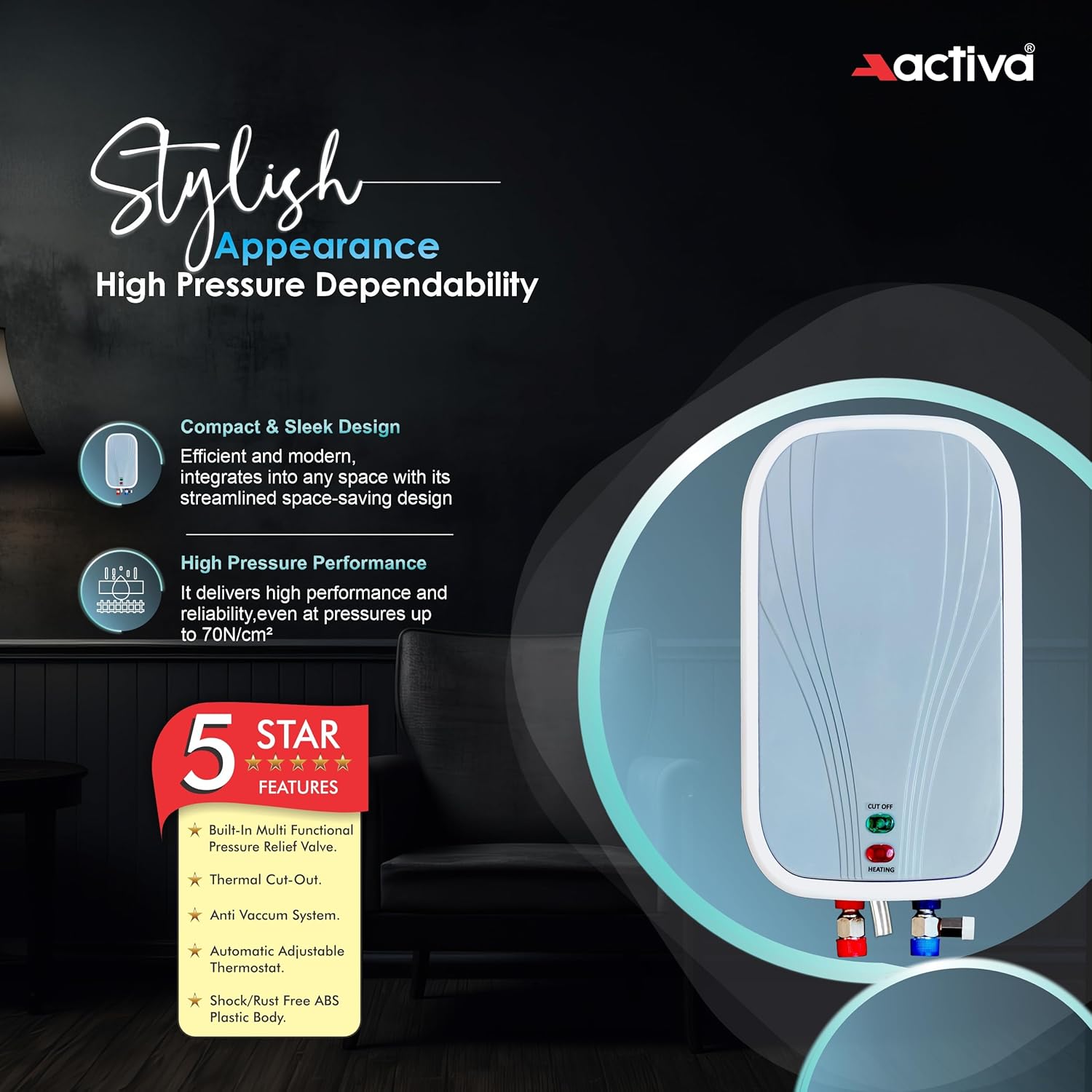High Quality Activa Thermostat To Prevent From Overheating Inner Tank. Automatic Thermal Cut-Off, a Pressure Release Valve and a fusible plug to give 4 layers of safety.