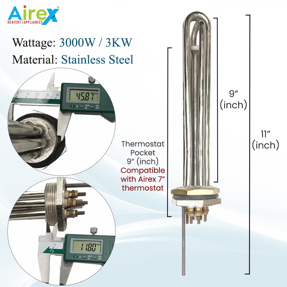 Airex Brand Airex Stainless Steel Industrial Water Heater Immersion Heater Heating Element Diameter 1.5 Inch B.S.P Triiple Pipe, Available in 3000 Watt