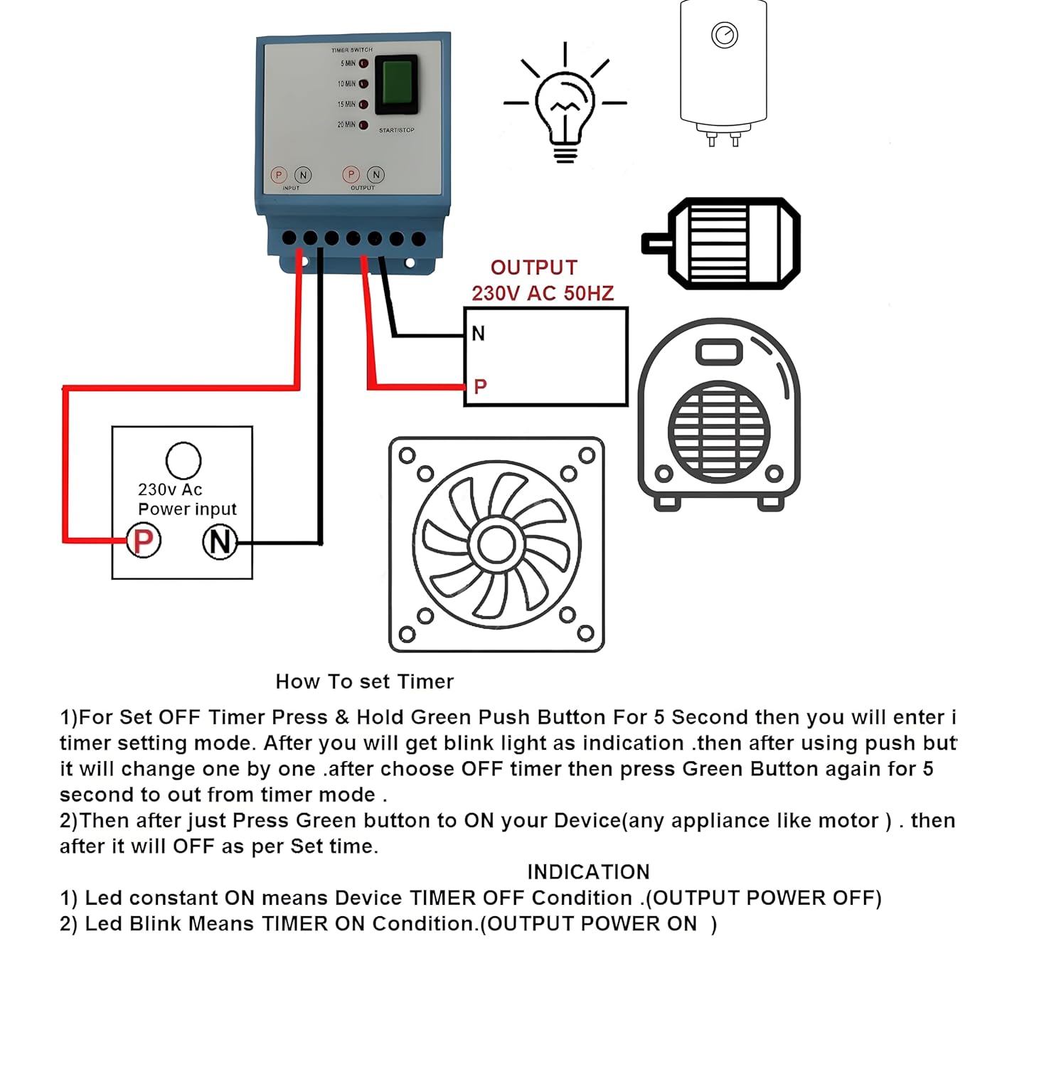 Features: Easy & onetime setup for long term Robust Design (Strong & Thick material) Led indication of operating condition Automatic off as per set timer Plastic Abs virgin Enclosure