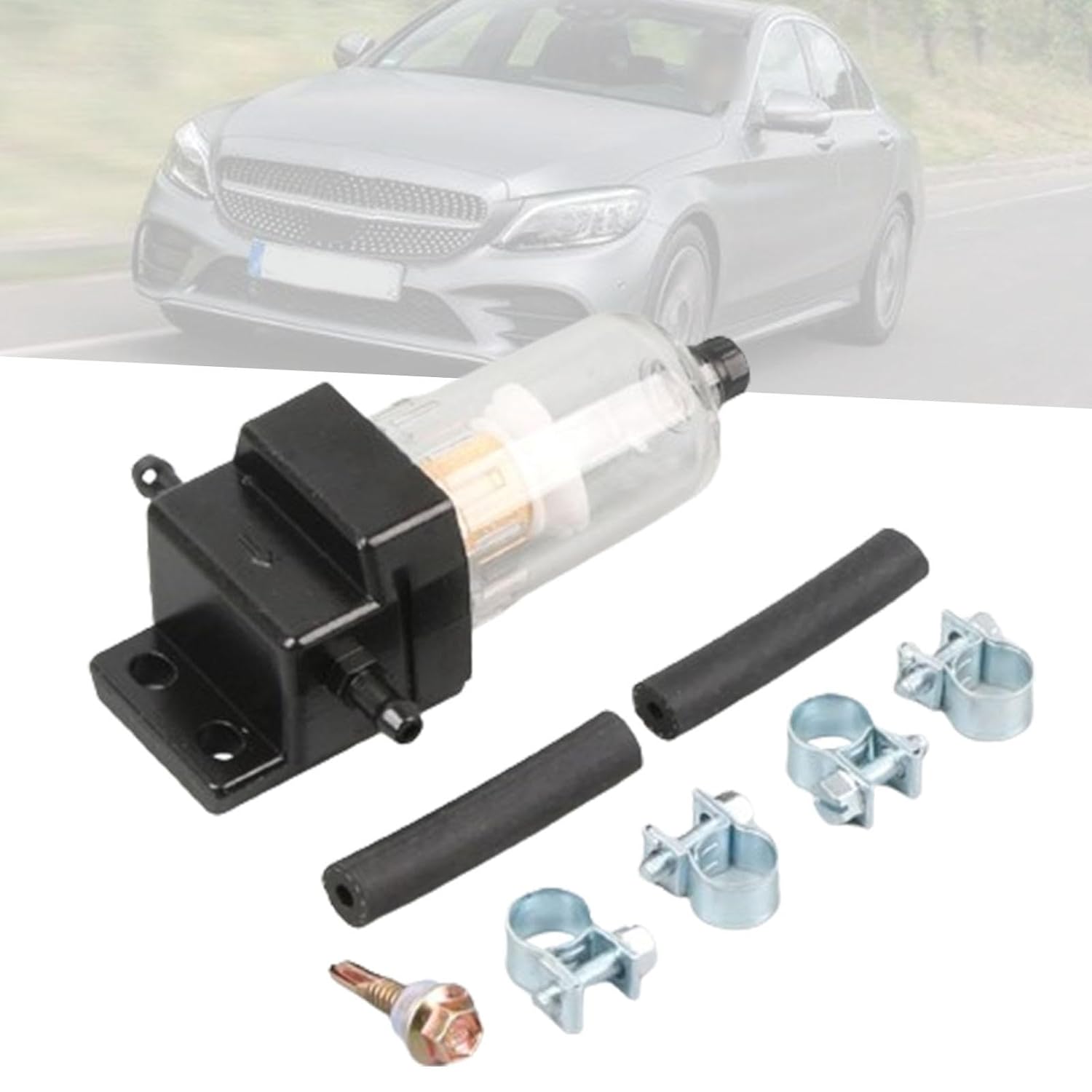 Package Includes: 1 Fuel Strainer Water Separator, 4 Clamps, 2 Hoses, 1 Screw