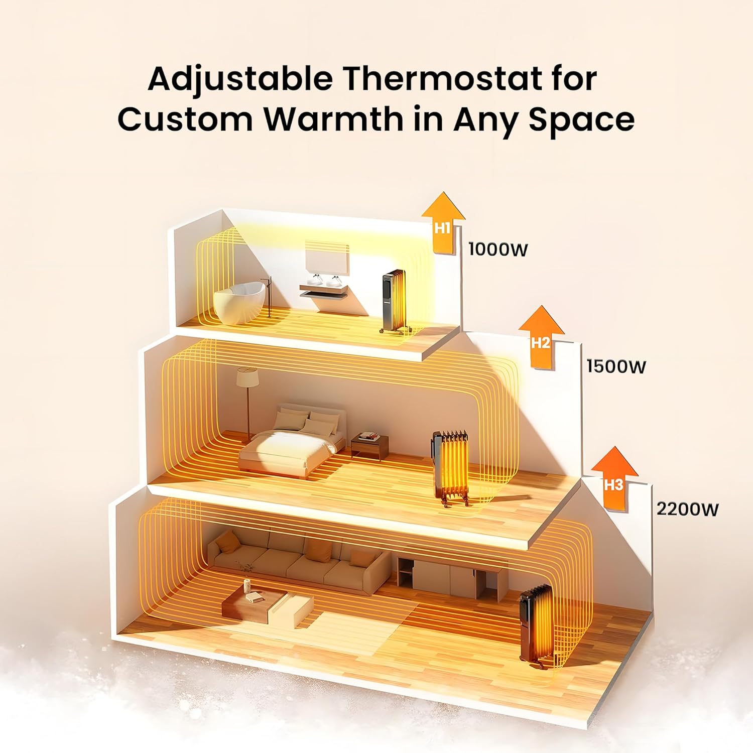 **EFFICIENT HEATING**: Experience quick warmth with a powerful 2200W output and three heating modes in this oil heater, perfect for medium to large rooms.