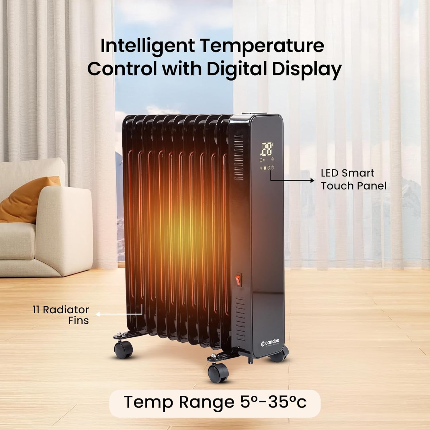 Experience unmatched warmth this winter with the Candes Room Heater, designed to deliver efficient room heating in cold months. This 11FIN OFR heater for room in winter features a robust 2200W power, making it an ideal oil heaters for home use, especially in medium or large size rooms. This Room heater oil filled three heating modes including Eco Comfort and anti-frost mode, it provides rapid multidirectional heating while ensuring comfortable breathing. This elegant black color oil room heater and sleek design add a touch of sophistication to any living room or bedroom. Customers appreciate blower heater for home for its ease of remote operation, 1-24 hours timer, and adjustable thermostat, ensuring tailored comfort at your fingertips. Featuring castor wheels for easy mobility, this portable heater for room in winter can be conveniently moved to wherever you need warmth. Enjoy the peace of mind with this oil heater with its overheat protection, a safety tip-over switch, child lock feature, and silent operations. Made from high-grade HD300 oil for long-lasting heating efficiency, the Candes Electric Heater is ISI approved, ensuring safe performance. Ideal for cold weather and designed for heating your home this winter, this room heater for home addresses common customer concerns regarding performance and safety. Choose the Candes Blower Heater, the perfect solution for an energy-efficient, comfortable winter experience, setting it apart from radiator heaters and oil-filled room heater options available in the market.