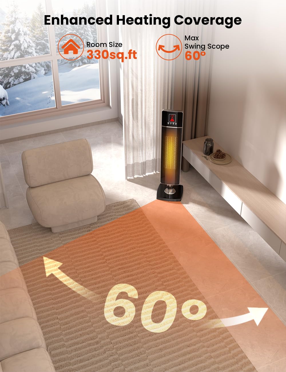 🏠【𝐂𝐨𝐯𝐞𝐫𝐬 𝐮𝐩 𝐭𝐨 𝟑𝟑𝟎 𝐬𝐪. 𝐟𝐭, 𝐒𝐮𝐢𝐭 𝐟𝐨𝐫 𝐌𝐞𝐝𝐢𝐮𝐦-𝐋𝐚𝐫𝐠𝐞 𝐒𝐩𝐚𝐜𝐞𝐬】Our ceramic heater for room features a broad 60° oscillation range for swift heating. With an airflow of up to 4000 RPM and a 2m heating air delivery distance, this ptc heater can raise the temperature to 20°C within minutes, providing warmth to a room of up to 330 sq. ft. Plus, our fan heater for room not only delivers swift warmth but also cuts costs by 50%.