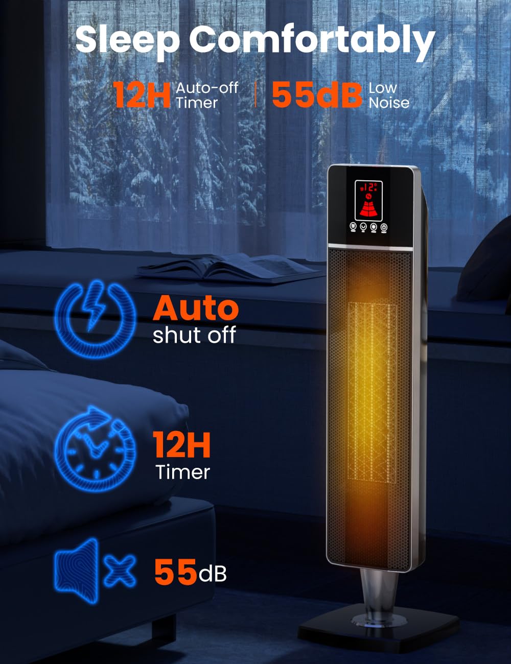 ⏰【𝟏𝟐-𝐇𝐨𝐮𝐫 𝐓𝐢𝐦𝐞𝐫 & 𝐋𝐨𝐰 𝐍𝐨𝐢𝐬𝐞 𝐑𝐮𝐧𝐧𝐢𝐧𝐠】Customize your heating duration with the 12-hour timer, saving up to 15% in energy costs by automatically shutting off the room heater for bedroom when it’s no longer needed. Our comfyhome room heater operates at a quiet 55dB, making it 30% quieter than comparable models, ensuring a peaceful environment.