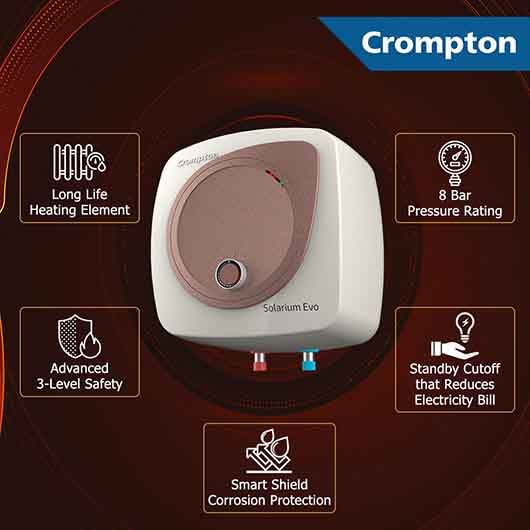 Crompton Water Heaters has advanced 3-level safety that keeps all parameters in check for protection against electric shocks and auto-off function in case of malfunction.