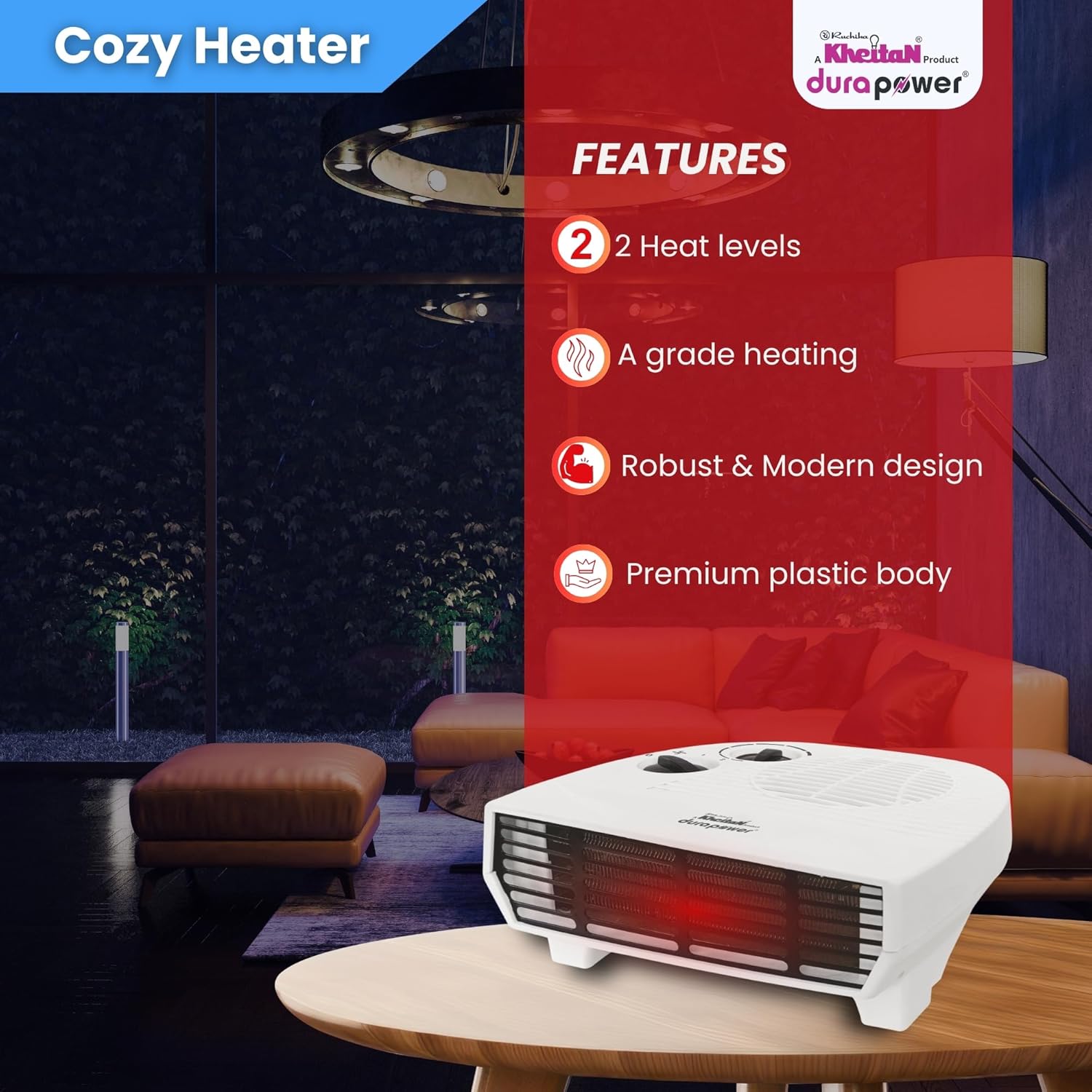 The Durapower COZY Portable Room Heater is your perfect year-round companion. With 2 heat levels offering 1000W/2000W power, it quickly adapts to your heating needs in winter, providing warmth in no time. In warmer months, it switches to normal air circulation, helping cool the room for a comfortable atmosphere. Featuring a premium plastic body for durability and a sleek modern design, it seamlessly blends into any space. Powered by an A-grade heating element and motor, the Durapower COZY guarantees efficiency and reliability, with a long wire for flexible operation and easy placement in any room.