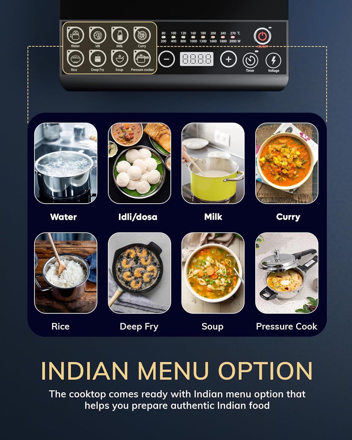 ▶INDIAN MENU OPTION WITH 8 TEMPERATURE: The cook-top comes with ready Indian Menu Options that help you prepare authentic Indian food like Chapati, Idli and Dosa, curries to rice, at the touch of a button, and have 8 power levels (80°C 270°C, 200W to 2000W) You can cook thousands types of food by spending just a few seconds, It’s so easy that you might not even believe it, perfect for braise, warming food, fry, simmer, steaming, boil, stir-frying, roast. Slow boiling, sauté, sear, steam