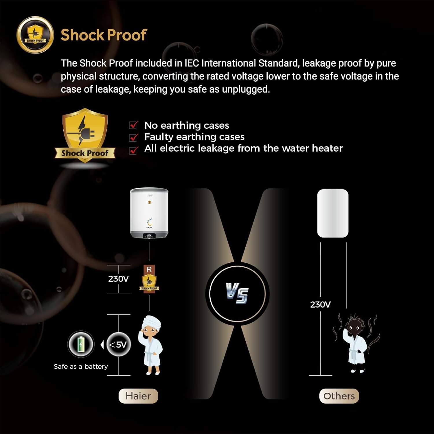 SHOCK PROOF: Experience unmatched safety with Haier’s globally leading shock proof technology. Unlike other water heaters that only cut off power during leakage, Haier water heater ensures there’s absolutely no electric current in the water at all times. This revolutionary feature provides complete protection, giving you peace of mind during every shower. With Haier, your safety comes first, making it the ultimate choice for safe and worry-free bathing