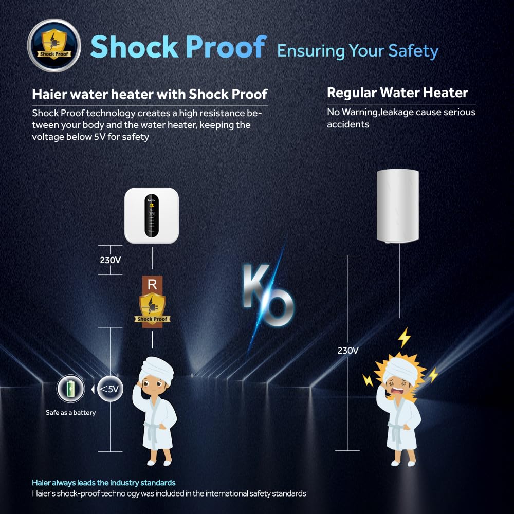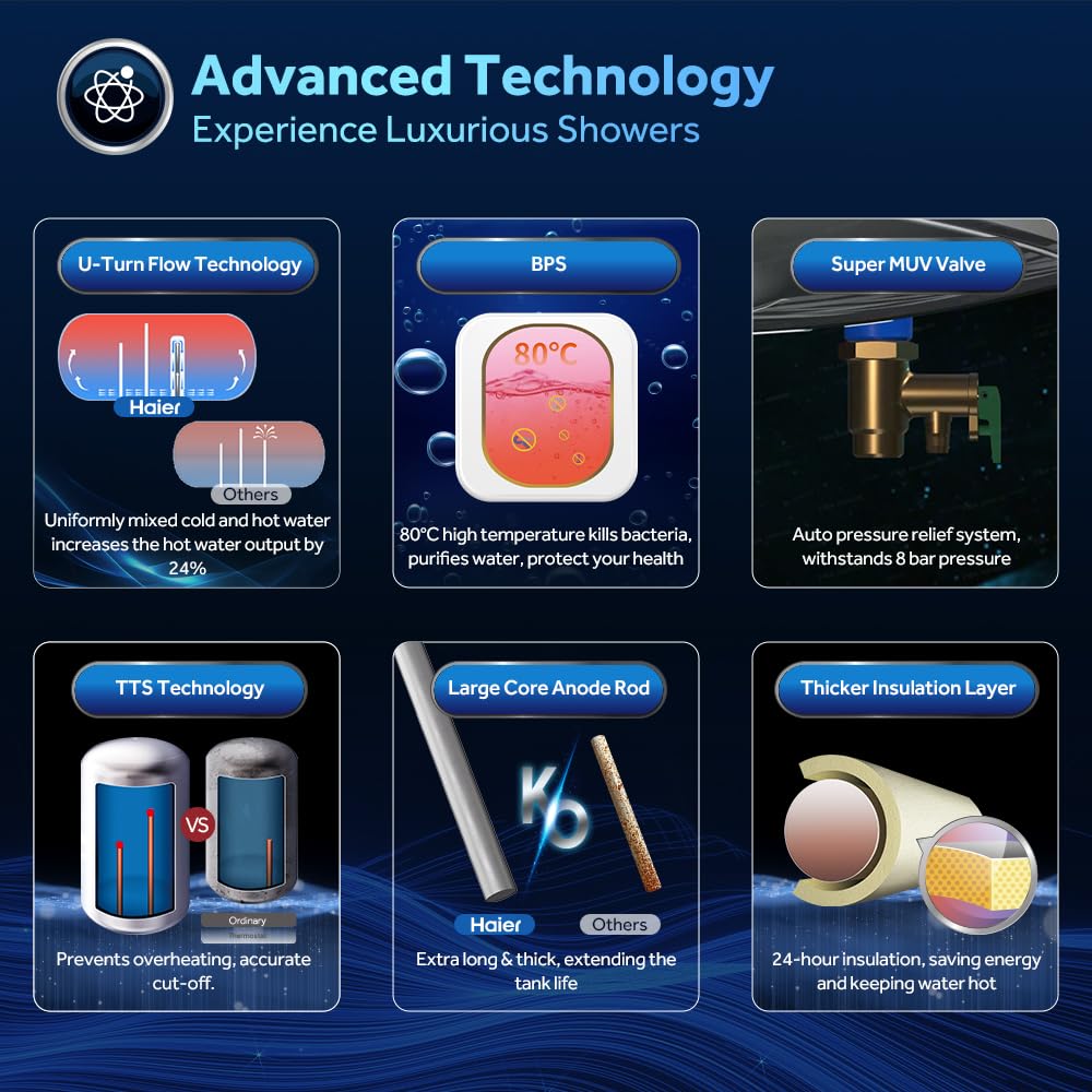 Comfort: More fresh shower by U-Turn Flow technology, Experience consistent and luxurious hot water with Haier Geyser’s advanced features. Enjoy the perfect temperature for refreshing showers and relaxing baths.