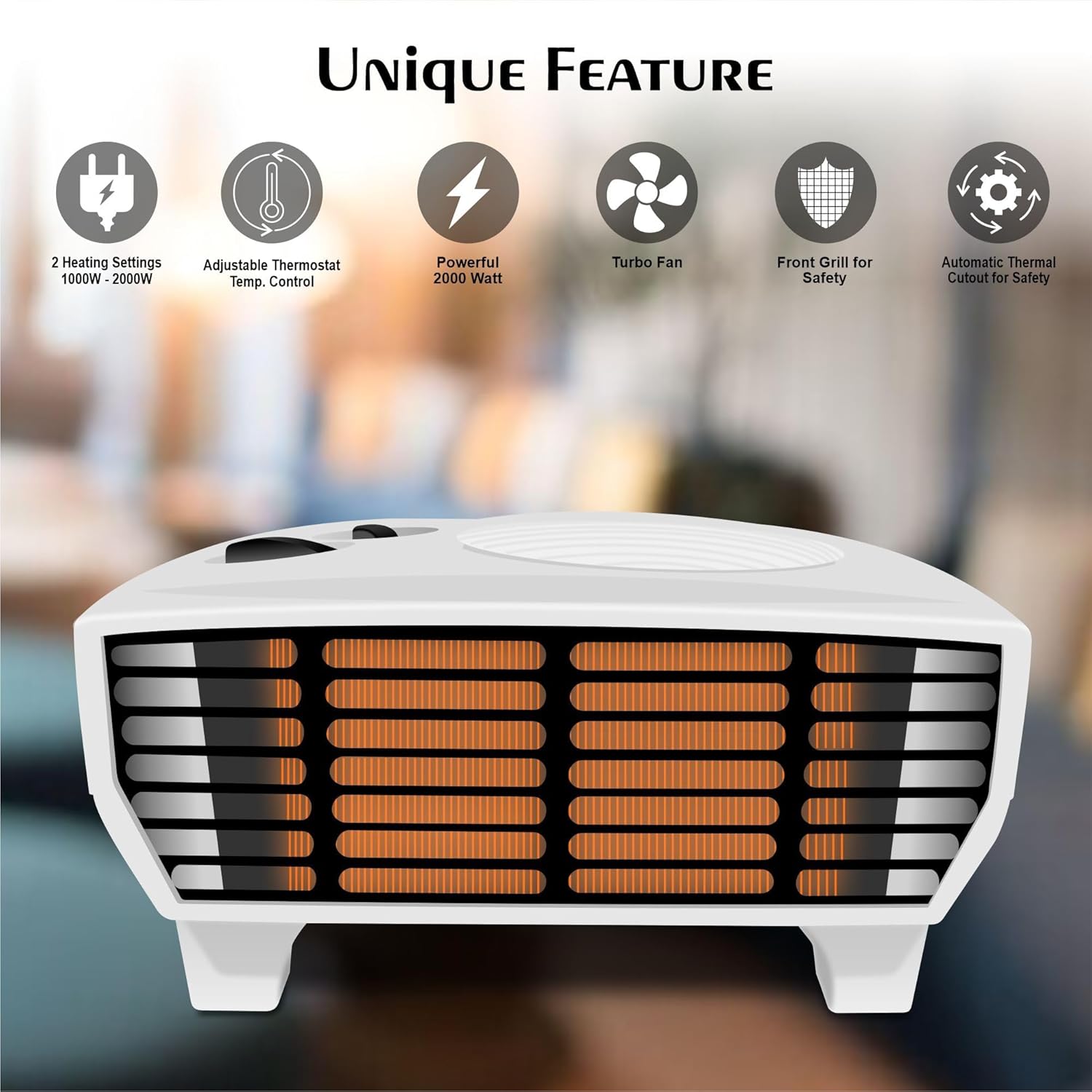 Dual Heating Modes: Enjoy efficient heating with 2000W high setting and 1000W low setting.