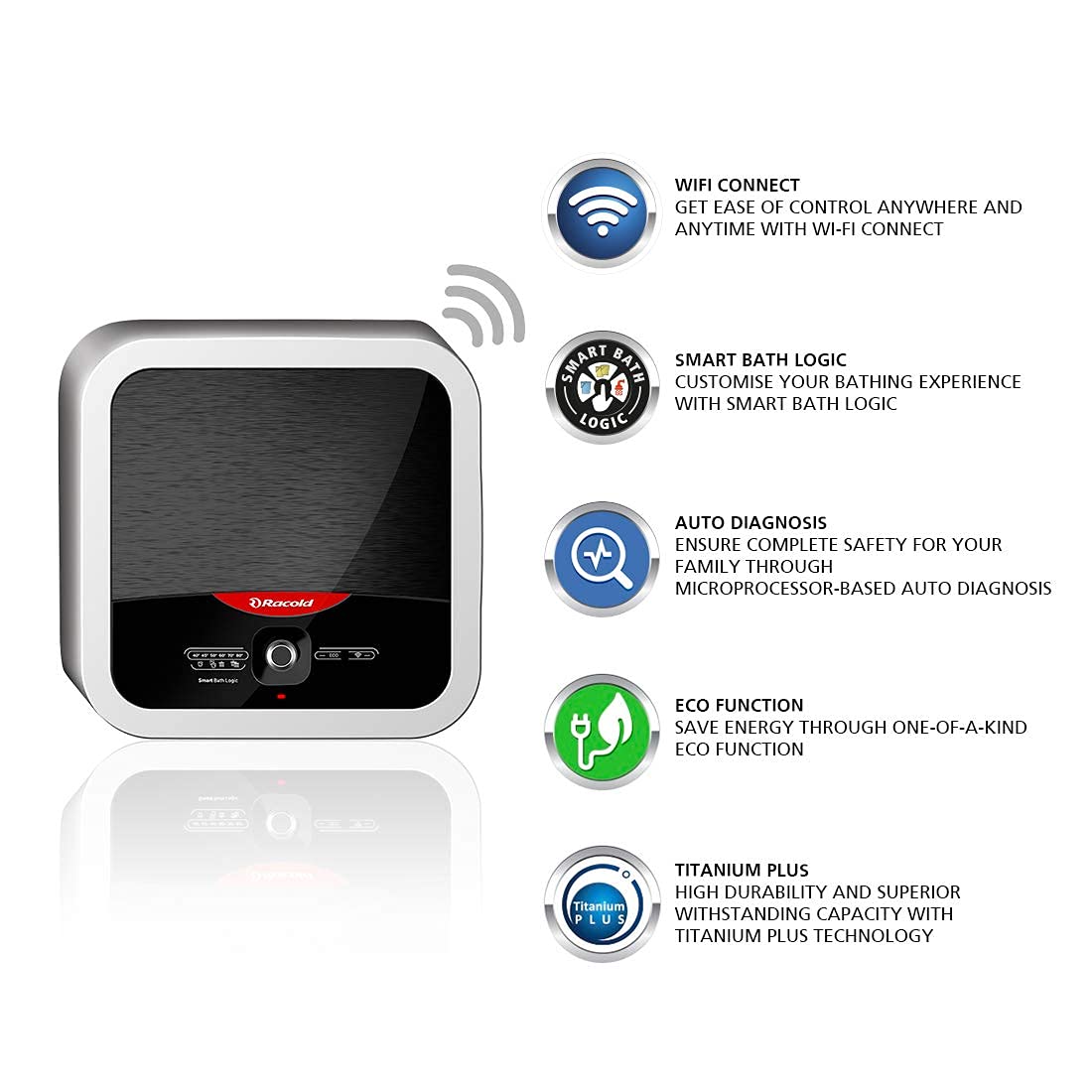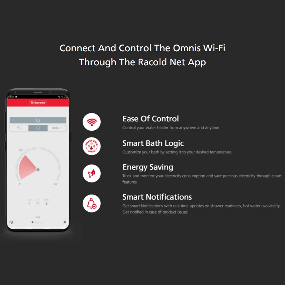 Auto Diagnosis: Omnis Wifi water heater has a revolutionary microprocessor that keeps all parameters in check automatically, This keeps you safe against electric shocks, sends you a notification and also shuts off automatically in case of any malfunction