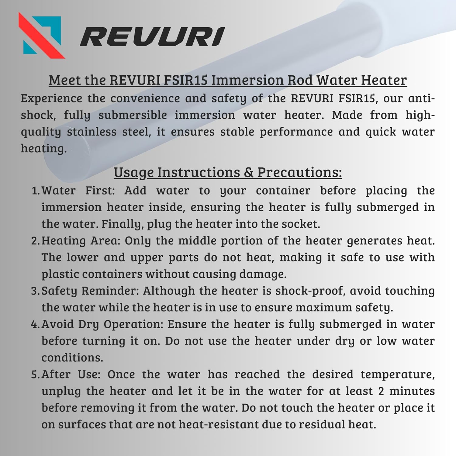 The Revuri FSIR15 Immersion Water Heater is the perfect solution for all your water heating needs, offering exceptional performance, safety, and durability. Designed with a shock-proof, fully submersible build, this immersion heater ensures safe operation across various tasks. Its premium stainless steel construction is resistant to corrosion, guaranteeing long-term reliability. With a 1.5 kW power rating and 220V-230V voltage, this electric water heater efficiently heats water, focusing only on the middle portion, making it ideal for use with plastic containers. Measuring 14 inches in length with a 1-inch rod diameter and a 1.77-inch cone-shaped rubber cap, the Revuri FSIR15 stands out with its innovative design. Whether you need a water heater rod for home or industrial applications, upgrade to this reliable, efficient water immersion heater and enjoy quick, safe, and energy-optimized heating.