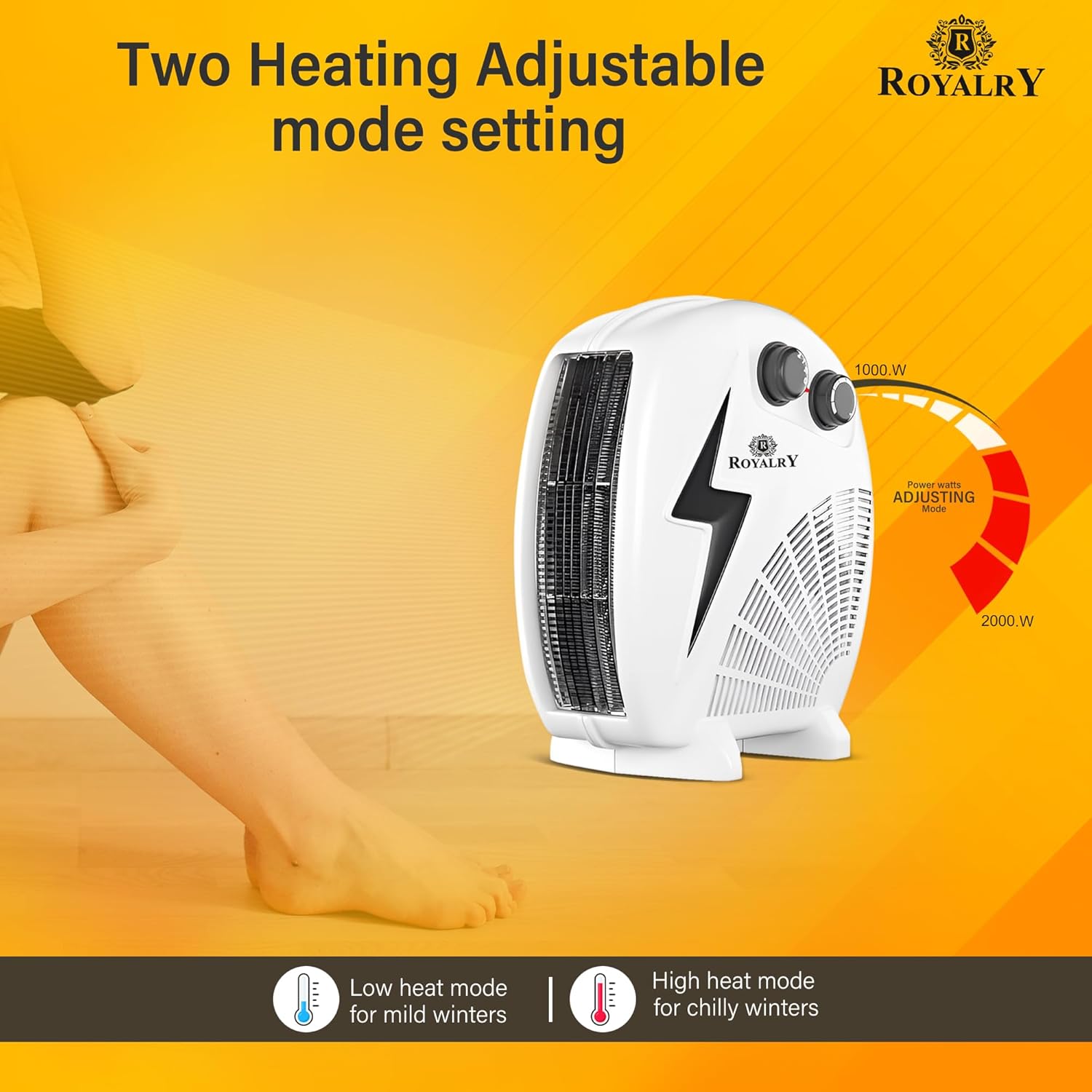 ENERGY EFFICIENT OPERATION:- Thanks to its built-in thermostat, the Royalry heater adjusts its power consumption based on the room’s temperature, ensuring optimal warmth without wasting energy. The two heat settings allow you to choose the level of heat you need, saving electricity by switching to lower power when needed, making it a cost-effective solution for maintaining a comfortable indoor climate.