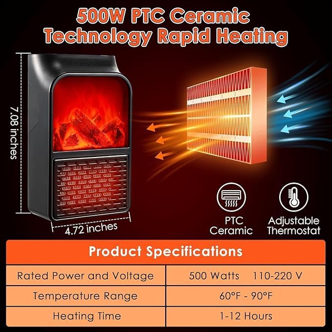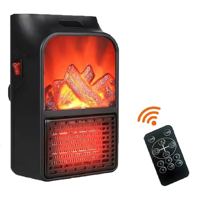 Transform any space into a cosy retreat with this compact and powerful 1500-watt handy heater. Perfect for personal warming in bedrooms, offices, or bathrooms, this wall-mounted unit features an innovative flame effect display that adds a touch of ambiance while delivering efficient heat. The built-in temperature control and included remote allow for precise comfort adjustment from anywhere in the room. Its space-saving design plugs directly into standard wall outlets, making it an ideal solution for areas where floor space is limited. The sleek black exterior and modern aesthetic complement any décor while the turbo heat function provides quick warmth when needed. This portable heater offers versatile heating options for small to medium-sized rooms, making it a practical choice for supplemental heating throughout your living or workspace.