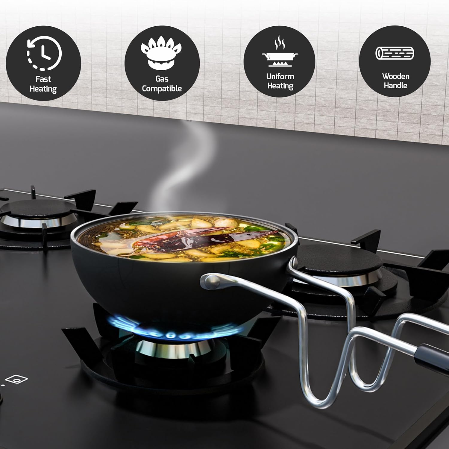 Features – 100% PFOA Free, Less oil use, Unbreakable Handle, uniform Heating, Anti-Scratch, induction and gas stove Base