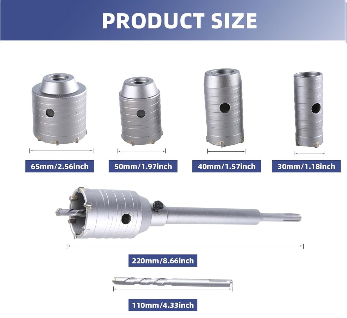 UPTO DATE PRODUCTS 5 PCS Concrete Hole Sawing Set Wall Drilling 30mm 40mm 50mm 65mm Masonry Hole Sawing Kits for Concrete Cement Brick Stone 200mm SDS Rod