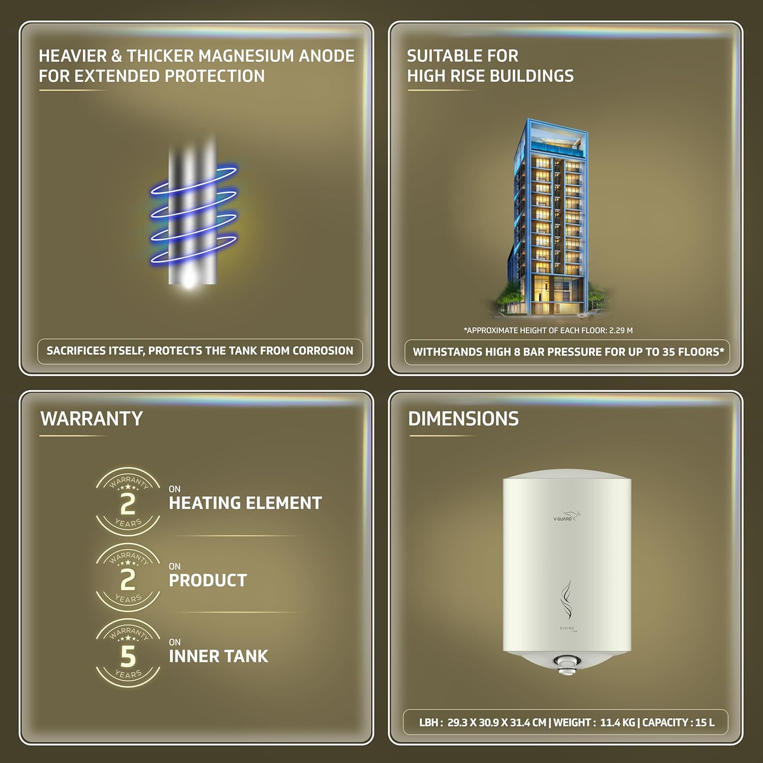 ANTI-CORROSIVE & SUITABLE FOR HARD WATER USAGE: Advanced Vitreous Enamel Coating protects the Inner Tank, Superior Incoloy 800 Heating Element ensures Sustained Performance, Extra Thick Magnesium Anode provides Added Protection