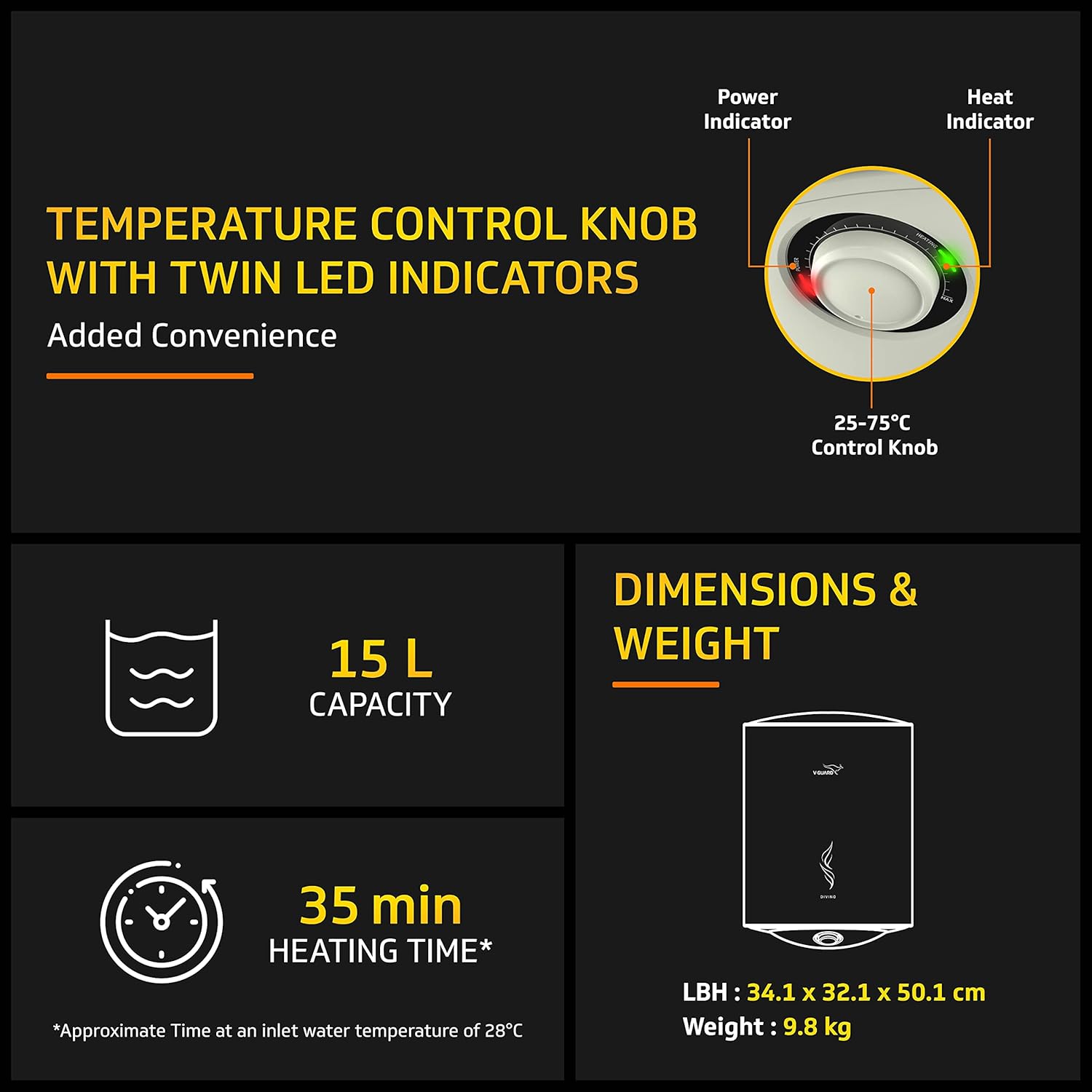 【15 LITRE】Storage Water Heater; 【BEE 5 STAR RATED】: Highly Energy Efficient with Extra Thick & High Density CFC Free PUF Insulation for Maximum Heat Retention;【COUNTRY OF ORIGIN】: India