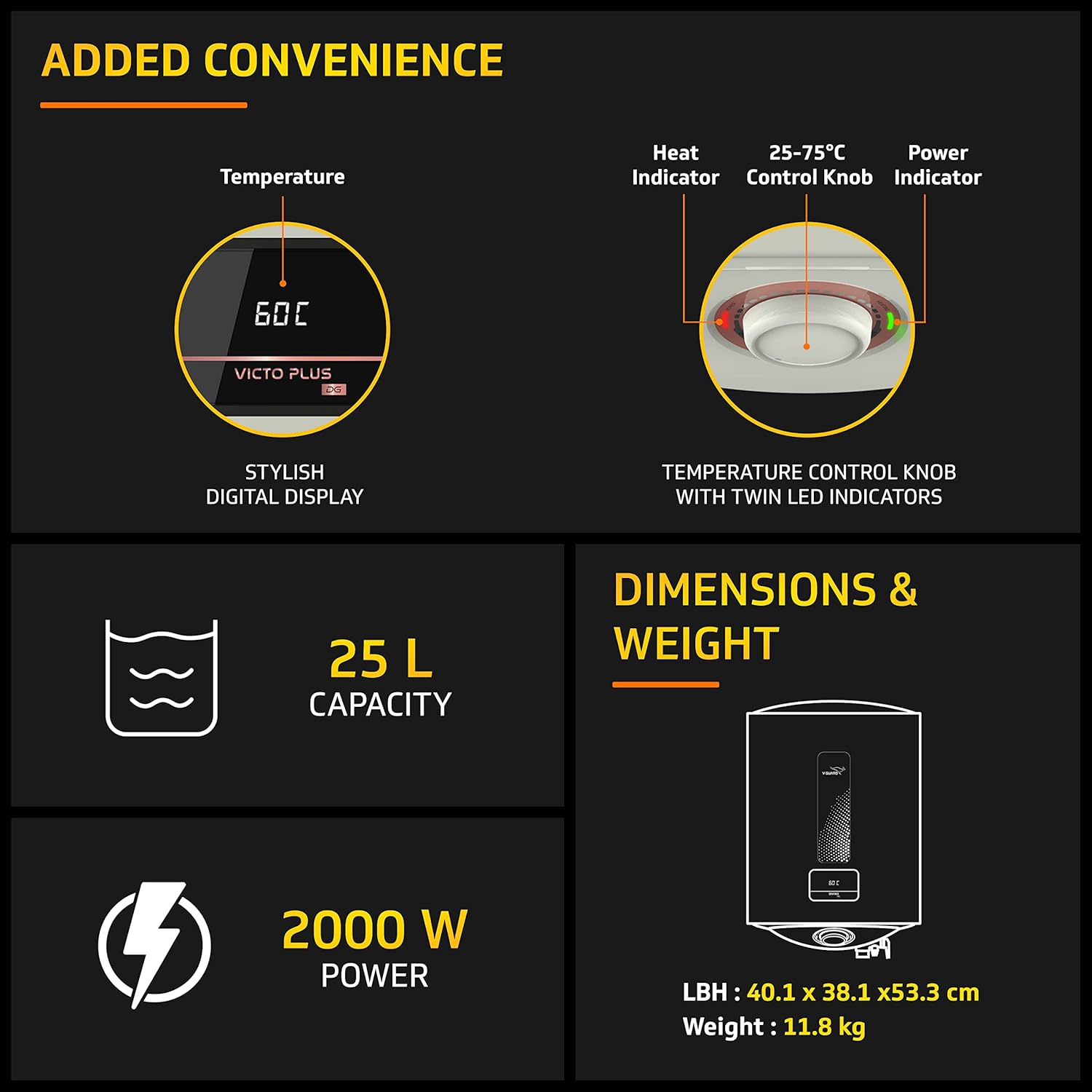Victo Plus DG Storage Water Heater features a sporty & stylish digital display that shows the actual water temperature